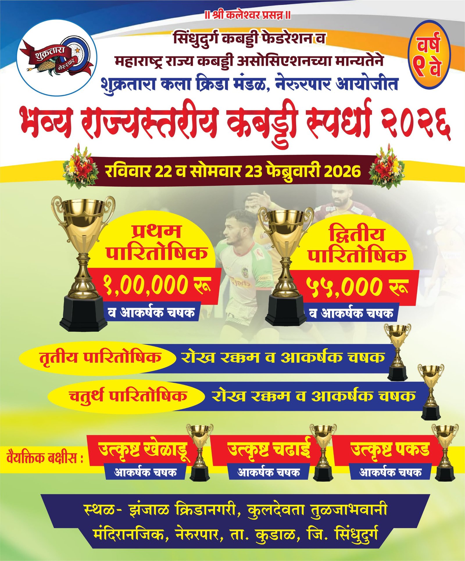 ◼️प्रो कब्बडी बेंगलुरू बुल्सचे शुभम बिटके,साईल राणे तर, दबंग दिल्लीचा सुशांत साईल,पुणेरी पलटंनचा वैभव राबाडे,पटना पारयटचा साहिल पाटील हे दिग्गज खेळाडू राहणार आहेत. ✒️लोकसंवाद /- कुडाळ. शुक्रतारा कला क्रीडा मंडळ नेरुरपार कुुडाळ आयोजित महाराष्ट्र राज्य कबड्डी असोसिएशनच्या मान्यतेने व सिंधुदुर्ग कबड्डी फेडरेशनच्या सहकार्याने राज्यस्तरीय कबड्डी स्पर्धा दिनांक 22 व 23 …