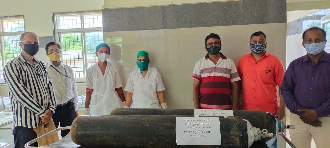 कुडाळ येथील महिला व बाल रुग्णालयात सुरू असलेल्या कोव्हीड केअर सेंटर ला महाराष्ट्र राज्य शिक्षक समिती शाखा कुडाळ च्या वतीने आज दि २० मे २०२१ रोजी दोन जम्बो ऑक्सीजन सिलेंडर प्रदान करण्यात आले या रुग्णालयाचे डॉ प्रमोद वालावलकर यांनी आपत कालिन परिस्थितीसाठी २ जम्बो ऑक्सीजन सिलेडरची मागणी समिती शाखेकडे केली त्याच बरोबर सेंटर मधील एखाद्या पेशंटला इमर्जन्सी ऑक्सीजन द्यायच्या समस्येबाबत कशी धावपळ होते त्यामूळे इमर्जन्सी वापरासाठी संघटनेकडे जम्बो ऑक्सीजन सिलेंडरची मागणी केली होती विषयाचे गांभीर्य लक्षात घेऊन तालुकाध्यक्ष प्रसाद वारंग यांनी तात्काळ याची दखल घेत