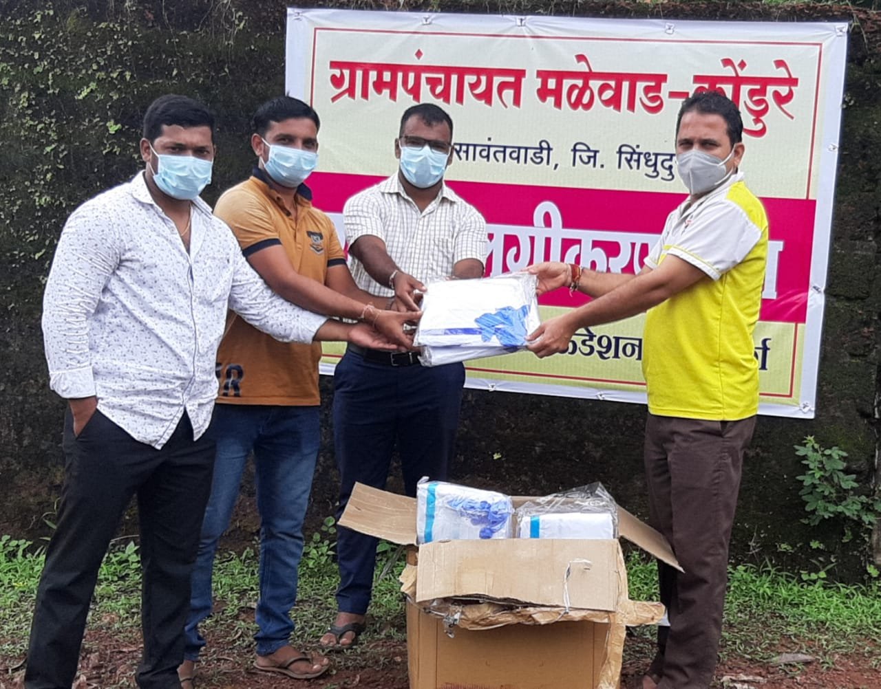 फोटो ओळ — सरपंच मराठे यांच्याकडे पीपी किट देताना युवक
