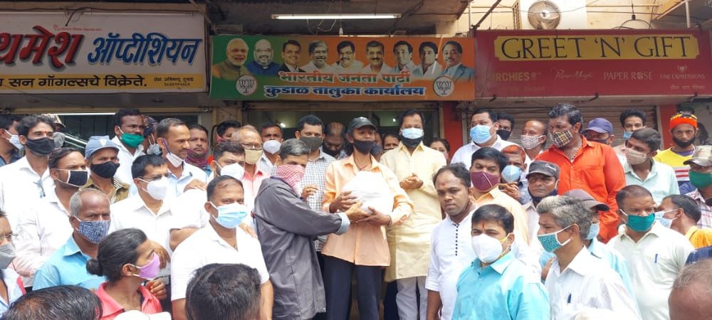 करोना महामारीमुळे सिंधुदुर्गातील दशावतारी कलावंत अक्षरशः मेटाकुटीस आले आहेत या कलेवर उपजीविका असणारे कलाकार संकटात सापडलेले आहे त्यांना सामाजिक भावनेतून भाजपा नेते आणि माजी खासदार निलेश राणे यांनी जीवनावश्यक वस्तूंचे साहित्य पुरवठा केला यासाठी तालुकाध्यक्ष विनायक राणे यांनी पुढाकार घेतला आणि कुडाळ तालुका भारतीय जनता पार्टी कार्यालयामध्ये सोमवार दिनांक 5/7/21 रोजी या वस्तूंचे वाटप करण्यात आले त्यावेळी कलाकारांच्या चेहऱ्यावर समाधान व्यक्त करण्यात आले. या कार्यक्रम प्रसंगी भाजपा जिल्हाध्यक्ष श्री. राजन तेली, उपाध्यक्ष रणजित देसाई ,तालुकाध्यक्ष विनायक राणे ,माजी नगराध्यक्ष ओंकार तेली ,शहराध्यक्ष राकेश कांदे, युवा मोर्चा तालुकाअध्यक्ष रूपेश कानडे ,राजू राऊळ, देवेंद्र नाईक, संदेश नाईक ,सुनील बांदेकर ,बंड्या सावंत ,विजय कांबळी ,गजानन वेंगुर्लेकर, सोशल मीडिया चे अविनाश पराडकर, राजवीर पाटील महिला शहराध्यक्ष सौ ममता धुरी, रेवती राणे, रेखा काणेकर, प्रसन्ना गंगावणे ,संजय परब , सामाजिक कार्यकर्ते राजेश महाडेश्वर, सुमित बांबुळकर ,देवराज राणे, राजू बक्षी ,निलेश तेंडुलकर, शेखर राणे ,सुप्रसिद्ध समालोचक राजा सामंत यांसह कुडाळ तालुक्यातील दशावतारी कलावंत उपस्थित होते. यावेळी माजी खासदार निलेश राणे यांचे मनापासून धन्यवाद आणि आभार दशावतारी कलाकारांच्या वतीने श्री. बच्चू कोंडुरकर ,श्री. वालावलकर यांनी मांडले कार्यक्रमाचे सूत्रसंचालन शहराध्यक्ष राकेश कांदे यांनी केले.