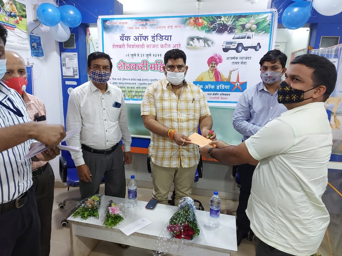 बँक ऑफ इंडियाच्या राष्ट्रीयकरणाच्या ५२ व्या वर्धापन दिनानिमित्त आज बँक ऑफ इंडियाच्या कणकवली शाखेत किसान मेळावा आयोजित करण्यात आला. त्या अंतर्गत बँकेच्या कणकवली, नांदगाव, सांगवे या शाखां द्वारा शेतकरी सहाय्यता कर्ज (kcc), कृषीवाहन, स्वयं सहाय्यता बचत गट, आणि शेतकरी सोनं तारण कर्ज योजनेमध्ये कर्ज मंजुरीची एकूण २५ लाखांची स्वीकृती पत्रे कुडाळ मालवणचे आमदार वैभव नाईक यांच्या हस्ते २४ लाभार्थ्यांना वितरित करण्यात आली. यावेळी आ. वैभव नाईक म्हणाले, शेतकऱ्यांसाठी शून्य टक्के व्याजाने कर्ज योजना, पीक विमा योजना सुरु आहेत मात्र आपले शेतकरी या योजनांचा लाभ घेण्यापासून वंचित राहत आहेत. या योजनांची माहिती शेतकऱ्यांपर्यंत पोचली पाहिजे. सिंधुदुर्ग जिल्ह्यातील शेतकरी १०० टक्के कर्जाची फेड करतात. त्यामुळे बँक ऑफ इंडियाने आमच्या शेतकऱ्यांवर विश्वास ठेवून त्यांना कर्ज, विमा योजनांचा लाभ मिळवून द्यावा.शेतकऱ्यांच्या हितासाठी बँक ऑफ इंडियाने घेतलेला किसान मेळावा कौतुकास्पद आहे.असे त्यांनी सांगितले. यावेळी बँकेच्या अधिकाऱ्यांनी शेतकरी कर्ज आणि विमा योजनांची माहिती उपस्थित शेतकऱ्यांना दिली.या किसान मेळाव्याला शेतकऱ्यांचा उत्स्फूर्त प्रतिसाद लाभला. याप्रसंगी बँक ऑफ इंडियाचे अग्रणी जिल्हा प्रबंधक प्रदीप प्रामाणिक, अधिकारी युनियनचे अध्यक्ष नंदकुमार प्रभुदेसाई, कणकवली शाखेचे वरिष्ठ शाखा प्रबंधक हेमंत मीना, यांसह अन्य शाखांचे शाखा प्रबंधक, बँक कर्मचारी शेतकरी मित्र व ग्राहक उपस्थित होते.