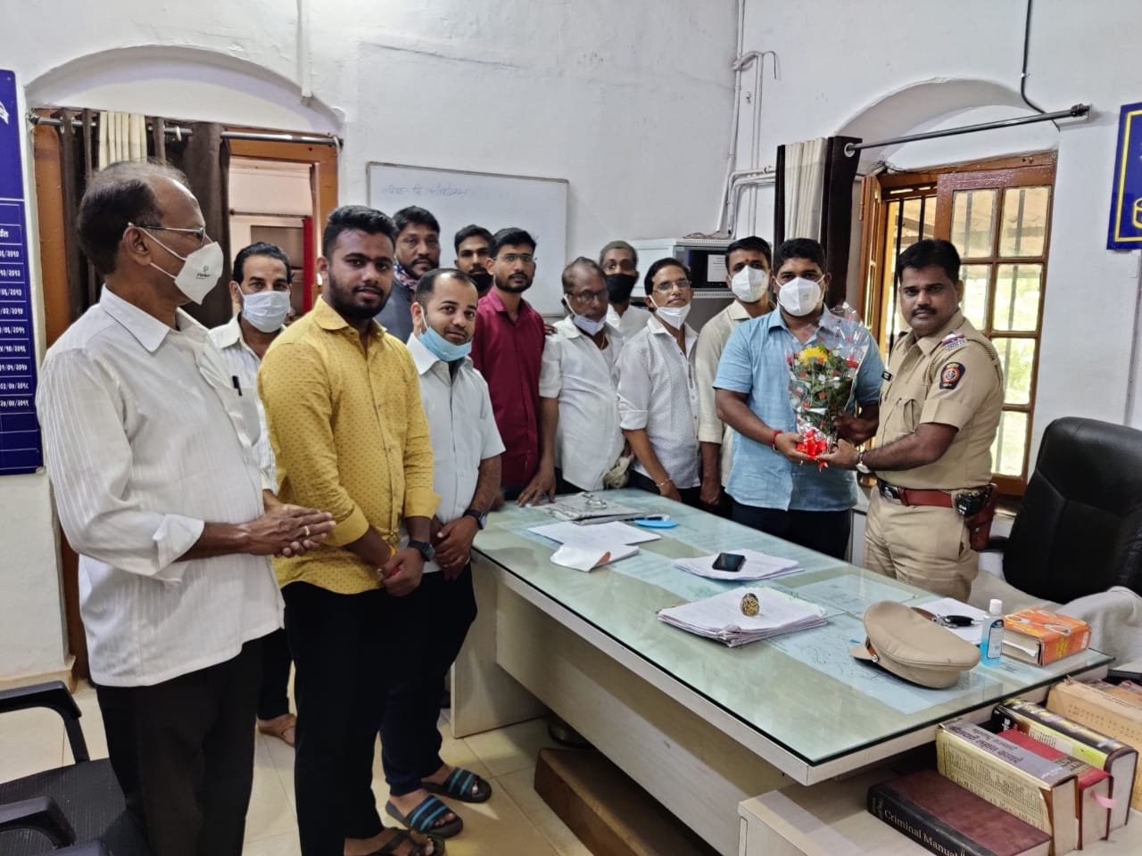 कुडाळ पोलीस ठाण्याचे नवनिर्वाचित पोलिस निरीक्षक यांचे आज गुरुवारी कुडाळ तालुका राष्ट्रीय काँग्रेसच्या वतीने स्वागत करण्यात आले.हे स्वागत काँग्रेसचे अभय शिरसाट यांच्या नेतृत्वाखाली काँग्रेसच्या वतीने करण्यात आले.पुढे अभय शिरसाट म्हणाले की ,यापूर्वी जसे कुडाळ तालुका पोलीस स्टेशनचे पोलीस निरीक्षक यांनी ज्याप्रमाणे काम केले त्याप्रमाणे आपण काम करा आणि नागरिकांना कायम सहकार्य करा असे शिरसाट यांनी सांगितले.कुडाळ तालुका राष्ट्रीय काँग्रेसचे प्रभारी अध्यक्ष अभय शिरसाट यांच्या सोबत पोलिस निरीक्षक फुलचंद यांचे स्वागत करताना चिन्मय बांदेकर ,उल्हास शिरसाट ब,वैभव आजगावकर ,मंदार शिरसाट ,सदासेंन सावंत, सुंदर सावंत ,तबरेज शेख ,विजय प्रभू ,इंतियाज मुल्ला ,बकत्तावर मुजावर ,चिराग मुंज ,सागर मुळदेकर उपस्थित होते.