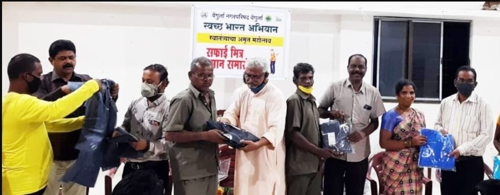 कोरोना महामारीच्या काळात न डगमगता, स्वतःचा जीव धोक्यात घालून अविरत सेवा देणा-या नगरपरिषदेच्या सर्व सफाई कामगारांना २२ सप्टेंबर रोजी रेनकोट देऊन सन्मानीत करण्यात आले. यावेळी नगराध्यक्ष दिलीप गिरप, मुख्याधिकारी डॉ.अमितकुमार सोंडगे, स्वच्छता सदेश दूत सुनिल नांदोस्कर, गटनेते सुहास गवंडळकर, नगरसेवक प्रशांत आपटे, नायब तहसिलदार नागेश शिदे, मंडळ अधिकारी बी.सी.चव्हाण, तलाठी सज्जा डी.बी.गोरड, उज्वला वजराटकर, सायली आंदुर्लेकर उपस्थित होते.