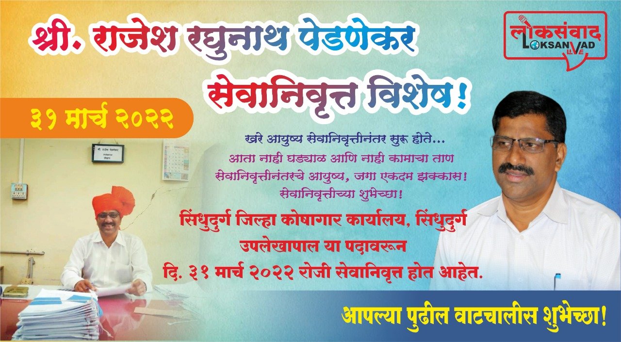 श्री.राजेश रघुनाथ पेडणेकर हे नियत वयोमानानुसार आज ३१ मार्च २०२२ रोजी सिंधुदुर्ग जिल्हा कोषागार कार्यालय सिंधुदुर्ग ओरोस येथून उपलेखापाल या पदावरून सेवानिवृत्त होत आहेत.पेडणेकर यांच्या सेवेची सुरूवात २९ जुलै १९९१ रोजी जिल्हा कोषागार कार्यालय कुडाळ येथे झाली.त्यानंतर त्यांची उपलेखापाल या पदी महाराष्ट्र शासन मुंबई मंत्रालयात त्यांची प्रथम पदोन्नती मिळाली,तयानंतर काही वर्षांनी त्यांची मेरीटाईम बोर्ड वेंगुर्ला आणि उपकोषागार कार्यालय वेंगुर्ला येथे काही वर्षे उपकोषागार अधिकारी म्हणून त्यांनी सेवा बजावली,ही सेवा बजावत असताना श्री.राजेश पेडणेकर यांनी कर्मचारी क्रिडा स्पर्धांमध्येही उल्लेखनीय कामगिरी केली आहे.आपल्या ३० वर्षे ८ महिन्याच्या या सेवेत प्रामाणिकपणे काम करत असताना त्यांनी सामाजिक क्षेत्रातही विशेष काम केले आहे.अश्या प्रकारे शासकीय सेवा सांभाळत सामाजिक ,क्रीडा क्षेत्रात उल्लेखनीय काम करणाऱ्या राजेश रघुनाथ पेडणेकर यांना त्यांच्या सेवानिवृत्ती नंतरच्या पुढील जीवनात खूप,खूप,, शुभेच्छा!