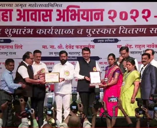 भारतीय स्वातंत्र्याच्या अमृत महोत्सवानिमित्त राज्यात 20 नोव्हेंबर 2022 ते 31 मार्च 2023 कालावधीत अमृत महाआवास अभियान 2022- 23 राबविण्यात येणार आहे याचा शुभारंभ मुख्यमंत्री एकनाथ शिंदे यांच्या शुभहस्ते उपमुख्यमंत्री देवेंद्र फडणवीस ग्रामविकास मंत्री गिरीष महाजन,अतिरिक्त मुख्य सचिव राजेश कुमार, राज्य संचालक राजाराम दिघे इतर मान्यवर यांच्या प्रमुख उपस्थितीत यशवंतराव चव्हाण सेंटर ऑडिटोरियम जगन्नाथ भोसले मार्ग नरीमन पॉईंट मुंबई येथे पार पडला या कार्यक्रमादरम्यान महाआवास अभियान 2020-21 मध्ये उत्कृष्ट काम केलेल्या संस्था व व्यक्ती यांचा सन्मानचिन्ह व प्रशस्तीपत्र देऊन गौरव करण्यात आला.