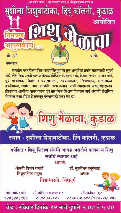 सुशीला शिशुवाटीका, हिंदू कॉलनी, कुडाळ आयोजित विष्णु शिशु मेळावा आयोजन केले आहे.भारतीय पध्दतीच्या शिक्षणाचा सिंधुदुर्गात सुरु असलेला प्रयोग पाहण्याची सुवर्ण संधी शैक्षणिक प्रगती म्हणजे केवळ बौध्दिक विकास नव्हे, केवळ लेखन, वाचन नव्हे, पूर्व प्राथमिक शिक्षणात प्रयोगशाळा, स्वयंपाकघर, चित्रशाळा, कलाशाळा, कार्यशाळा, रंगमंच, बाग, प्रदर्शनी, तरण तलाव, प्राणी संग्रहालय, वस्तू संग्रहालय, क्रीडांगण आदींचा वापर करुन पूर्व प्राथमिक शिक्षण दिल्यास सर्व अंगांनी शैक्षणिक विकास कसा होईल हे समजून घेण्यासाठी जरुर भेट द्या.शिशु मेळावा, दिनांक १२ मार्च रविवारी दुपारी २ ते ५ वेळेत आयोजित केले आहे. कुडाळ स्थान : सुशीला शिशुवाटीका, हिंदु कॉलनी, कुडाळ अपेक्षित शिशु शिक्षण संबंधी आवड असलेले पालक व शिशु सर्वांचे स्वागत आहे.असे आवाहन श्रीमती विजय रामाणे शिशुवाटिका प्रमुख ,डॉ. मुरलीधर प्रभुदेसाई अध्यक्ष विद्याभारती, सिंधुदुर्ग ,श्री. श्रीधर गोरे ९४०३४०३९६० ,सौ. योगिता कवटणकर ८६९८०७११८५ ,सौ. कविता कुंटे. यांच्यावतीने करण्यात आले आहे.