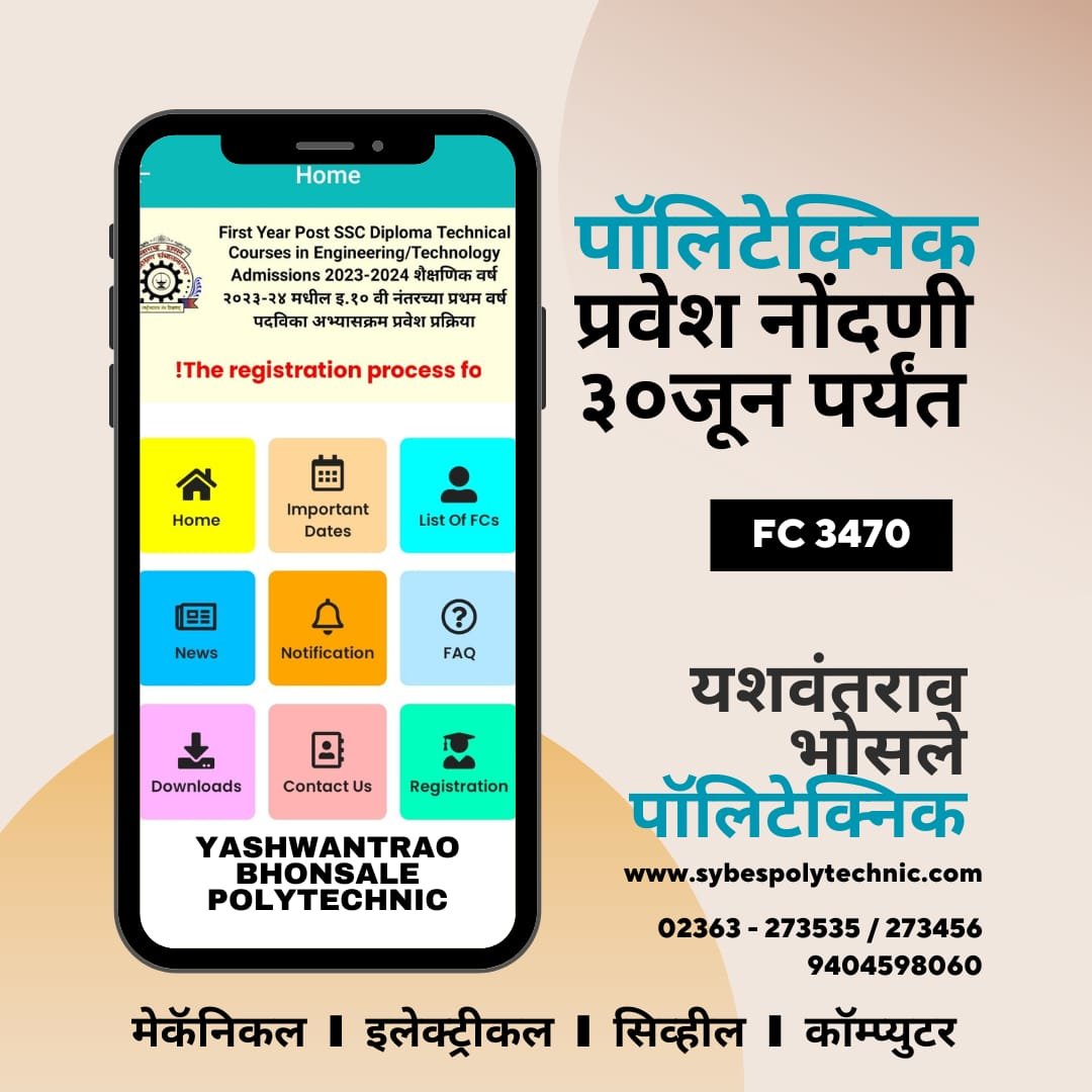 दहावीच्या परीक्षेचा ऑनलाईन निकाल जाहीर झाल्यानंतर पुढील अभ्यासक्रमांच्या प्रवेश प्रक्रियेला सुरुवात झाली आहे. दहावीनंतर विद्यार्थ्यांना तंत्रशिक्षणाची संधी उपलब्ध असून तीन वर्षांच्या पॉलिटेक्निक डिप्लोमासाठी विद्यार्थी प्रवेश घेऊ शकतात. शासनाने पॉलिटेक्निक प्रवेशप्रक्रियेला मुदतवाढ दिली असून इच्छुक विद्यार्थी 30 जूनपर्यंत जवळच्या प्रवेश सुविधा केंद्रावर नाव नोंदणी करू शकतात.यशवंतराव भोसले पॉलिटेक्निक, सावंतवाडी येथे महाराष्ट्र शासनाच्या तंत्रशिक्षण संचालनालयाचे अधिकृत प्रवेश सुविधा केंद्र (FC 3470) उपलब्ध असून या ठिकाणी 30 जूनपर्यंत प्रवेशासाठी कागदपत्रांची पडताळणी व अर्ज भरण्याची निश्चिती करण्यात येईल._