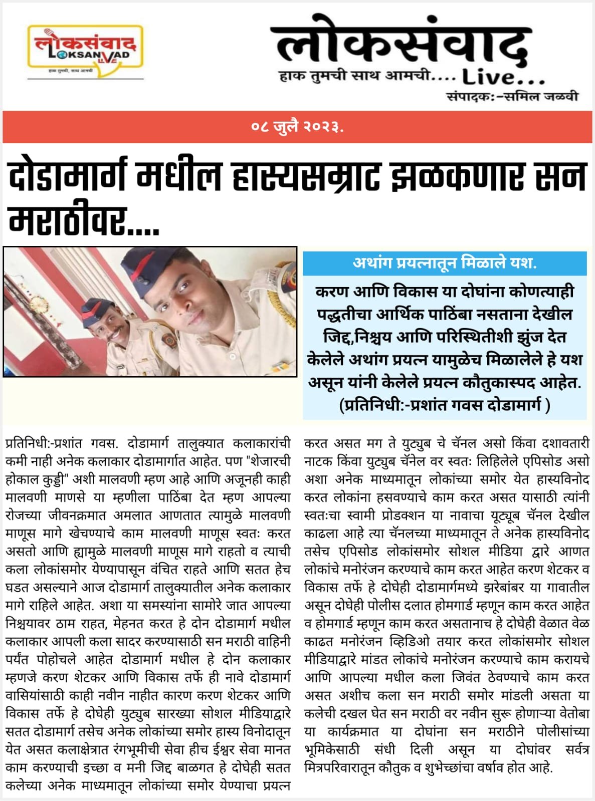दोडामार्ग तालुक्यात कलाकारांची कमी नाही अनेक कलाकार दोडामार्गात आहेत पण “शेजारची होकाल कुड्डी” अशी मालवणी म्हण आहे आणि अजूनही काही मालवणी माणसे या म्हणीला पाठिंबा देत म्हण आपल्या रोजच्या जीवनक्रमात अमलात आणतात त्यामुळे मालवणी माणूस मागे खेचण्याचे काम मालवणी माणूस स्वतः करत असतो आणि ह्यामुळे मालवणी माणूस मागे राहतो व त्याची कला लोकांसमोर येण्यापासून वंचित राहते आणि सतत हेच घडत असल्याने आज दोडामार्ग तालुक्यातील अनेक कलाकार मागे राहिले आहेत. अशा या समस्यांना सामोरे जात आपल्या निश्चयावर ठाम राहत, मेहनत करत हे दोन दोडामार्ग मधील कलाकार आपली कला सादर करण्यासाठी सन मराठी वाहिनी पर्यंत पोहोचले आहेत दोडामार्ग मधील हे दोन कलाकार म्हणजे करण शेटकर आणि विकास तर्फे ही नावे दोडामार्ग वासियांसाठी काही नवीन नाहीत कारण करण शेटकर आणि विकास तर्फे हे दोघेही युट्युब सारख्या सोशल मीडियाद्वारे सतत दोडामार्ग तसेच अनेक लोकांच्या समोर हास्य विनोदातून येत असत कलाक्षेत्रात रंगभूमीची सेवा हीच ईश्वर सेवा मानत काम करण्याची इच्छा व मनी जिद्द बाळगत हे दोघेही सतत कलेच्या अनेक माध्यमातून लोकांच्या समोर येण्याचा प्रयत्न करत असत मग ते युट्युब चे चॅनल असो किंवा दशावतारी नाटक किंवा युट्युब चॅनेल वर स्वतः लिहिलेले एपिसोड असो अशा अनेक माध्यमातून लोकांच्या समोर येत हास्यविनोद करत लोकांना हसवण्याचे काम करत असत यासाठी त्यांनी स्वतःचा स्वामी प्रोडक्शन या नावाचा यूट्यूब चॅनल देखील काढला आहे त्या चॅनलच्या माध्यमातून ते अनेक हास्यविनोद तसेच एपिसोड लोकांसमोर सोशल मीडिया द्वारे आणत लोकांचे मनोरंजन करण्याचे काम करत आहेत करण शेटकर व विकास तर्फे हे दोघेही दोडामार्गमध्ये झरेबांबर या गावातील असून दोघेही पोलीस दलात होमगार्ड म्हणून काम करत आहेत व होमगार्ड म्हणून काम करत असतानाच हे दोघेही वेळात वेळ काढत मनोरंजन व्हिडिओ तयार करत लोकांसमोर सोशल मीडियाद्वारे मांडत लोकांचे मनोरंजन करण्याचे काम करायचे आणि आपल्या मधील कला जिवंत ठेवण्याचे काम करत असत अशीच कला सन मराठी समोर मांडली असता या कलेची दखल घेत सन मराठी वर नवीन सुरू होणाऱ्या वेतोबा या कार्यक्रमात या दोघांना सन मराठीने पोलीसांच्या भूमिकेसाठी संधी दिली असून या दोघांच्याही सर्वत्र मित्रपरिवारातून कौतुक व शुभेच्छांचा वर्षाव होत आहे.
