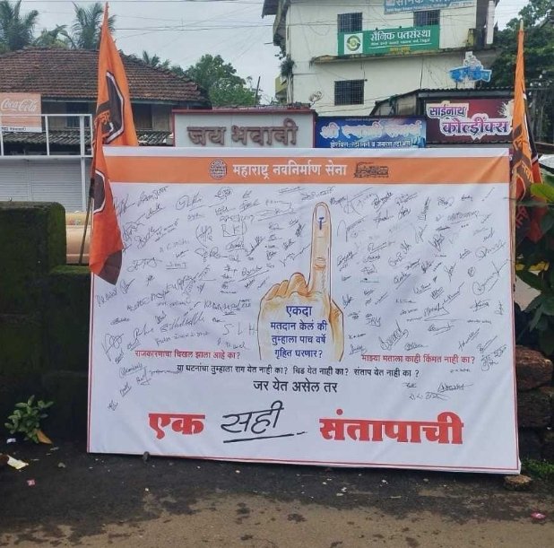 एकदा मतदान झालं की पाच वर्षे मतदाराला गृहीत धरून सुरू असलेल्या गलिच्छ राजकारणाला लोकप्रतिनिधी संख्या वाढवण्या च्या नादात झालेला चिखल या विरोधात सन्मा.राजसाहेब ठाकरे यांच्या आदेशावरून आणि सिंधुदुर्ग पक्ष निरीक्षक श्री.गजानन राणे आणि सरचिटणीस श्री.संदीप दळवी यांच्या सूचनेनुसार आज सिंधुदुर्ग मनसेच्या वतीने कुडाळ बस स्टँड परिसर येथे माजी जिल्हाध्यक्ष धीरज परब यांच्या उपस्थितीत एक सही संतापाची.. हे अभिनव आंदोलन करण्यात आले..या वेळी मोठ्या संख्येने नागरिकांनी आपल्या सह्या करत या आंदोलनाला पाठिंबा दर्शवला.