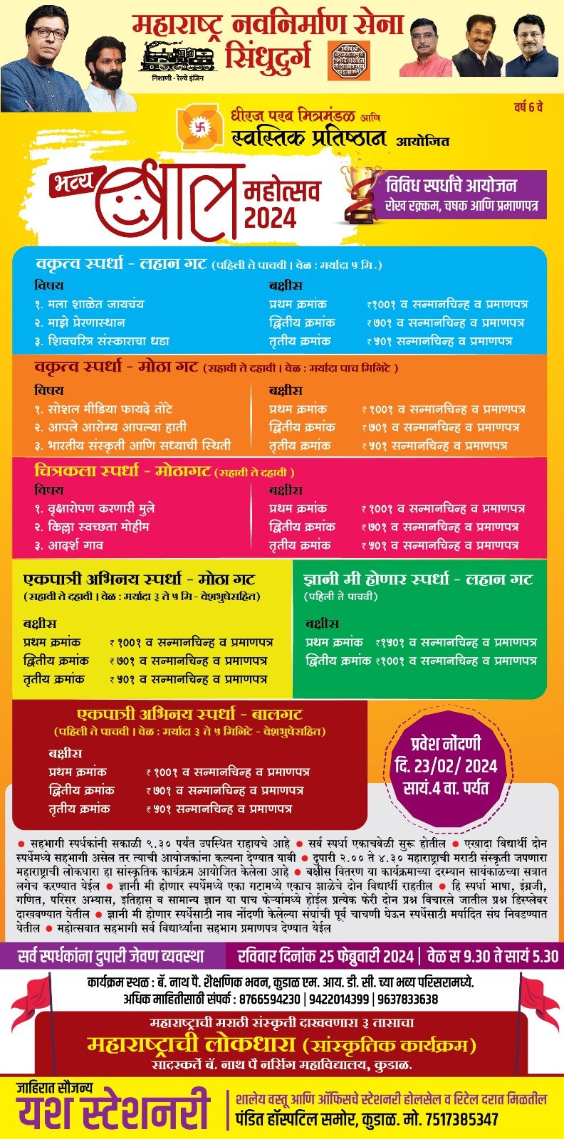 рдорд╣рд╛рд░рд╛рд╖реНрдЯреНрд░ рдирд╡рдирд┐рд░реНрдорд╛рдг рд╕реЗрдирд╛ рдЖрдгрд┐ рд╕реНрд╡рд╕реНрддрд┐рдХ рдкреНрд░рддрд┐рд╖реНрдард╛рди,рдХреБрдбрд╛рд│ рдпрд╛рдВрдЪреНрдпрд╛ рд╕рдВрдпреБрдХреНрдд рд╡рд┐рджреНрдпрдорд╛рдиреЗ рднрд╡реНрдп рдмрд╛рд▓рдорд╣реЛрддреНрд╕рд╡рд╛рдЪреЗ рдЖрдпреЛрдЬрди рдХреЗрд▓реЗ рдЖрд╣реЗ. рдпрд╛ рдордзреЗ рдкрд╣рд┐рд▓реА рддреЗ рджрд╣рд╛рд╡реА рд╡рдпреЛрдЧрдЯрд╛рддреАрд▓ рд╡рд┐рджрдпрд╛рд░реНрдерд╛рдВрдЪреНрдпрд╛ рд╡рд┐рд╡рд┐рдз рд╕реНрдкрд░реНрдзрд╛рдЪреЗ рдЖрдпреЛрдЬрди рдХреЗрд▓реЗ рдЖрд╣реЗ. рд╕рдХрд╛рд│реА 9.30 рд╡рд╛. рд░рдЬрд┐рд╕реНрдЯреНрд░реЗрд╢рди рдХрд░реБрди 5.30 рдкрд░реНрдпрдВрдд рд╕реНрдкрд░реНрдзрд╛ рдЖрдгрд┐ рд╕рд╛рдВрд╕реНрдХреГрддрд┐рдХ рдХрд╛рд░реНрдпрдХреНрд░рдо рдареЗрд╡рдгреНрдпрд╛рдд рдЖрд▓реЗ рдЖрд╣реЗрдд.