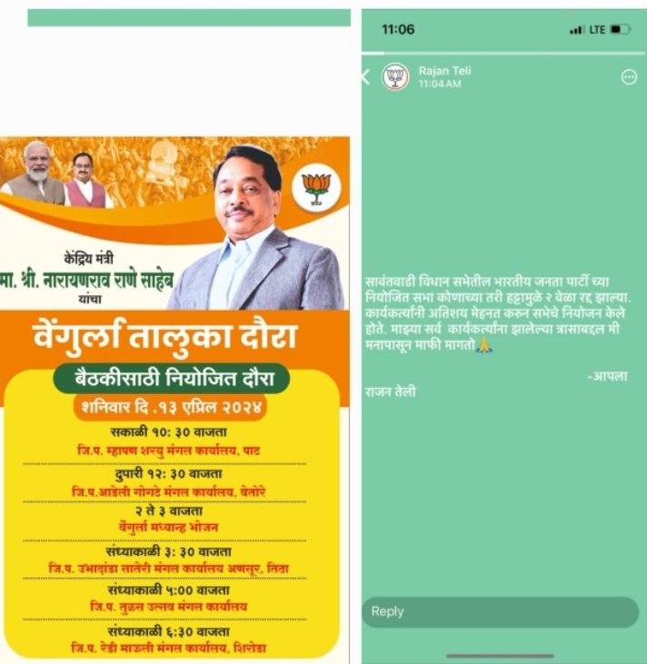 рд╕рд╛рд╡рдВрддрд╡рд╛рдбреА рдпреЗрдереАрд▓ рдорд╣рд╛рдпреБрддреАрдЪреНрдпрд╛ рдкреНрд░рдЪрд╛рд░ рдХрд╛рд░реНрдпрд╛рд▓рдпрд╛рдЪреЗ рдЖрдЬ рд╢рдирд┐рд╡рд╛рд░реА рд╕рдХрд╛рд│реА рд╣реЛрдгрд╛рд░реЗ рдЙрджреНрдШрд╛рдЯрди рдЕрдЪрд╛рдирдХ рд░рджреНрдж рдХрд░рдгреНрдпрд╛рдд рдЖрд▓реЗ.рддрд░ рдХреЗрдВрджреНрд░реАрдп рдордВрддреНрд░реА рдирд╛рд░рд╛рдпрдг рд░рд╛рдгреЗ рд╣реЗ рд╡реЗрдВрдЧреБрд░реНрд▓реЗ рддрд╛рд▓реБрдХреНрдпрд╛рдд рдкрд╛рдЪ рдЬрд┐рд▓реНрд╣рд╛ рдкрд░рд┐рд╖рдж рдорддрджрд╛рд░рд╕рдВрдШрд╛рддреАрд▓ рдХрд╛рд░реНрдпрдХрд░реНрддреНрдпрд╛рдВрдЪреА рд╕рдВрд╡рд╛рдж рд╕рд╛рдзрдгрд╛рд░ рд╣реЛрддреЗ.рддреЛ рд╣реА рдирд┐рдпреЛрдЬрд┐рдд рд░рд╛рдгреЗрдВрдЪрд╛ рджреМрд░рд╛ рдЕрдЪрд╛рдирдХ рд░рджреНрдж рдХреЗрд▓рд╛. рддреНрдпрд╛рдореБрд│реЗ рдирд┐рдпреЛрдЬрд┐рдд рдЕрд╕рд▓реЗрд▓рд╛ рд╕рд╛рд╡рдВрддрд╡рд╛рдбреАрдЪрд╛ рдорд╣рд╛рдпреБрддреАрдЪреНрдпрд╛ рдкреНрд░рдЪрд╛рд░ рдХрд╛рд░реНрдпрд╛рд▓рдпрд╛рдЪреЗ рдЙрджреНрдШрд╛рдЯрди рд╡ рдирд╛рд░рд╛рдпрдг рд░рд╛рдгреЗрдВрдЪрд╛ рд╡реЗрдВрдЧреБрд░реНрд▓рд╛ рддрд╛рд▓реБрдХрд╛ рджреМрд░рд╛ рдЕрдЪрд╛рдирдХ рд░рджреНрдж рдЭрд╛рд▓рд╛. рд╣рд╛ рдиреЗрдордХрд╛ рдХреЛрдгрд╛рдореБрд│реЗ рд░рджреНрдж рдЭрд╛рд▓рд╛? рд╣рд╛ рдкреНрд░рд╢реНрди рд╕рдХрд╛рд│реА рдЙрджреНрдШрд╛рдЯрдирд╛рд╕рд╛рдареА рд╕рд╛рд╡рдВрддрд╡рд╛рдбреА рддрд╛рд▓реБрдХреНрдпрд╛рддреВрди рдЖрд▓реЗрд▓реНрдпрд╛ рдкрджрд╛рдзрд┐рдХрд╛рд░реА рдХрд╛рд░реНрдпрдХрд░реНрддреНрдпрд╛рдВрдирд╛ рддрд╕реЗрдЪ рд╡реЗрдВрдЧреБрд░реНрд▓реЗрддреАрд▓ рд░рд╛рдгреЗрдВрдЪреА рд╡рд╛рдЯ рдкрд╛рд╣рдд рдЕрд╕рд▓реЗрд▓реНрдпрд╛ рднрд╛рдЬрдк рдХрд╛рд░реНрдпрдХрд░реНрддреНрдпрд╛рдВрдирд╛ рдкрдбрд▓рд╛ рдЖрд╣реЗ. рдорд╛рддреНрд░ рдорд╛рдЬреА рдЖрдорджрд╛рд░ рд░рд╛рдЬрди рддреЗрд▓реА рдпрд╛рдВрдиреА рд▓рд╛рд╡рд▓реЗрд▓рд╛ рд╕реНрдЯреЗрдЯреНрд╕ рд╕рдзреНрдпрд╛ рдЪрд░реНрдЪреЗрдЪрд╛ рд╡рд┐рд╖рдп рдард░рд▓рд╛ рдЖрд╣реЗ.