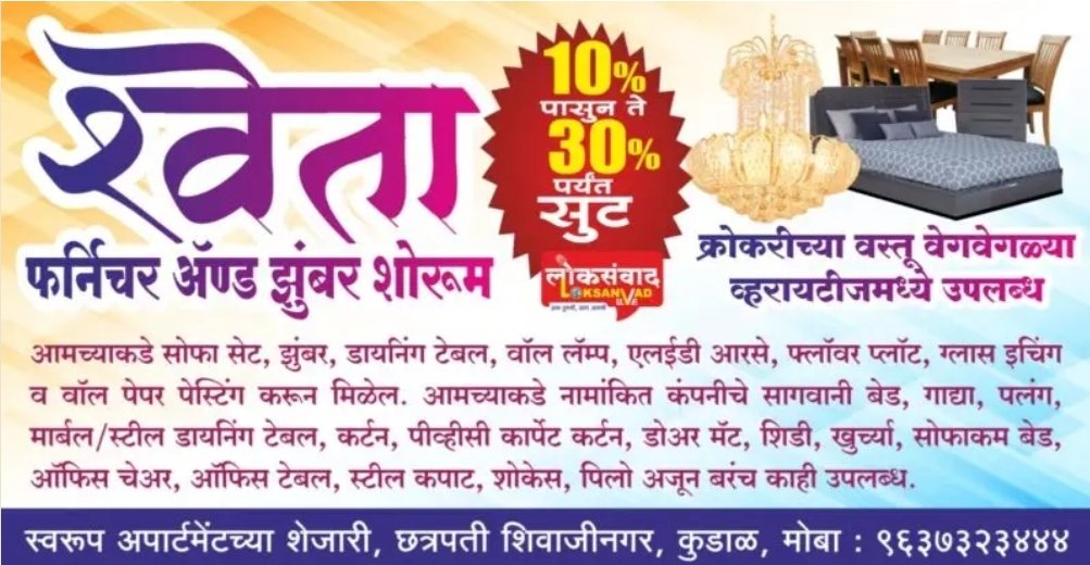 тЬЕрдЖрдордЪреНрдпрд╛рдХрдбреЗ рдирд╛рдорд╛рдВрдХрд┐рдд рдХрдВрдкрдиреАрдЪреЗ рд╕рд╛рдЧрд╡рд╛рдиреА рдмреЗрдб, рдЧрд╛рджреНрдпрд╛, рдкрд▓рдВрдЧ, рдорд╛рд░реНрдмрд▓/рд╕реНрдЯреАрд▓ рдбрд╛рдпрдирд┐рдВрдЧ рдЯреЗрдмрд▓, рдХрд░реНрдЯрди, рдкреАрд╡реНрд╣реАрд╕реА рдХрд╛рд░реНрдкреЗрдЯ рдХрд░реНрдЯрди, рдбреЛрдЕрд░ рдореЕрдЯ, рд╢рд┐рдбреА, рдЦреБрд░реНрдЪрд╛, рд╕реЛрдлрд╛рдХрдо рдмреЗрдб, рдСрдлрд┐рд╕ рдЪреЗрдЕрд░,рдСрдлрд┐рд╕ рдЯреЗрдмрд▓, рд╕реНрдЯреАрд▓ рдХрдкрд╛рдЯ,рд╢реЛрдХреЗрд╕, рдкрд┐рд▓реЛ рдЕрдЬреВрди рдмрд░рдВрдЪ рдХрд╛рд╣реА рдЙрдкрд▓рдмреНрдз.