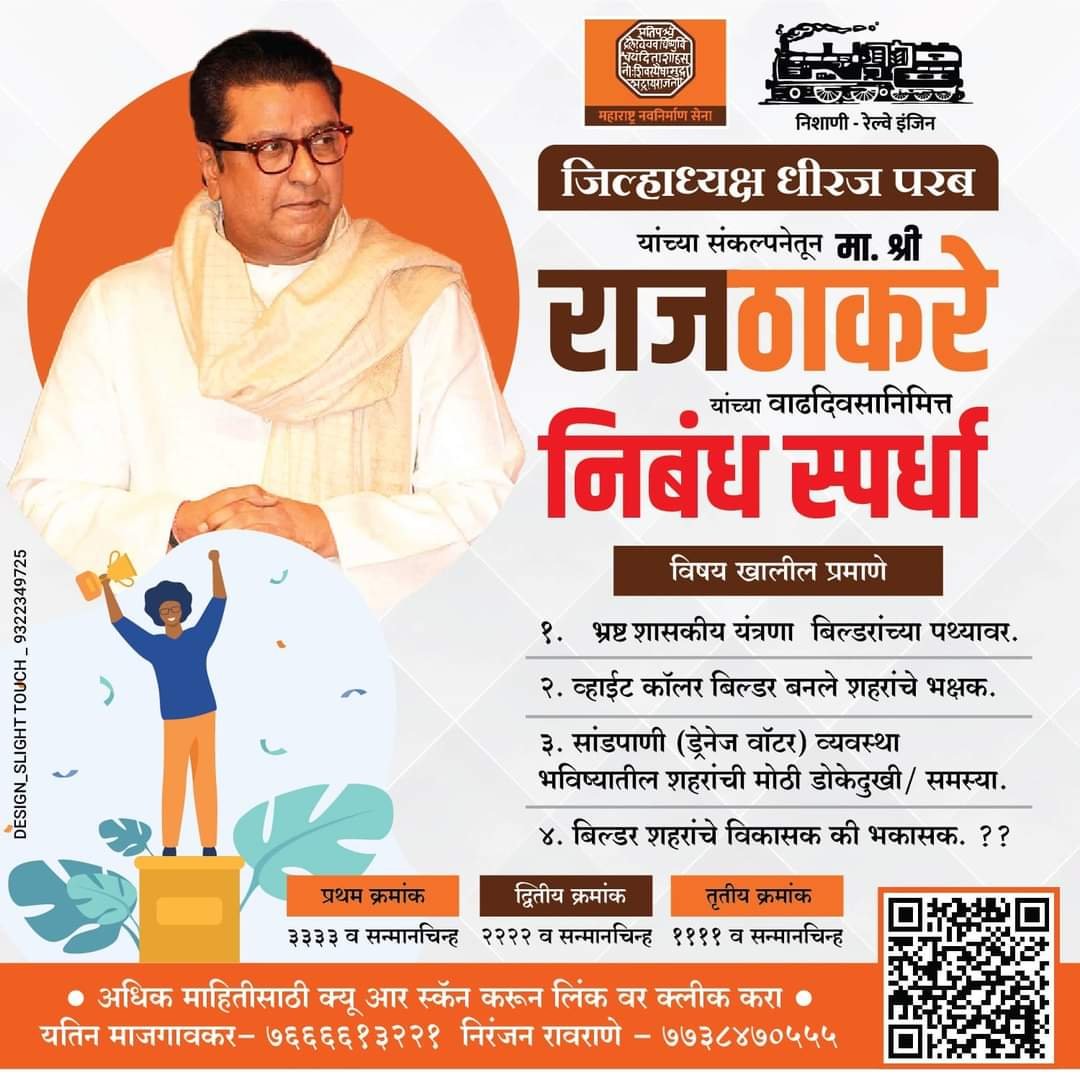 рдорд╣рд╛рд░рд╛рд╖реНрдЯреНрд░ рдирд╡рдирд┐рд░реНрдорд╛рдг рд╕реЗрдирд╛. рд╕рдВрд╕реНрдерд╛рдкрдХ, рдЕрдзреНрдпрдХреНрд╖ рдорд╛. рд░рд╛рдЬрд╕рд╛рд╣реЗрдм рдард╛рдХрд░реЗ рдпрд╛рдВрдЪреНрдпрд╛ рд╡рд╛рдврджрд┐рд╡рд╕рд╛рдирд┐рдорд┐рддреНрдд рдЬрд┐рд▓реНрд╣рд╛рдзреНрдпрдХреНрд╖ рдзреАрд░рдЬ рдкрд░рдм рдпрд╛рдВрдЪреНрдпрд╛ рд╕рдВрдХрд▓реНрдкрдиреЗрддреВрди, рд╕рд┐рдВрдзреБрджреБрд░реНрдЧ рдЬрд┐рд▓реНрд╣рд╛ рдорд░реНрдпрд╛рджрд┐рдд рдЦреБрд▓реА рдирд┐рдмрдВрдз рд╕реНрдкрд░реНрдзреЗрдЪреЗ рдЖрдпреЛрдЬрди рдХрд░рдгреНрдпрд╛рдд рдЖрд▓реЗ рдЖрд╣реЗ.рдорд╛рдирд╡рд╛рдЪреНрдпрд╛ рдкреНрд░рдЧрддреА рдмрд░реЛрдмрд░ рд╢рд╣рд░рд╛рдЪрд╛ рд╕реБрджреНрдзрд╛ рдкреНрд░рдЪрдВрдб рд╡реЗрдЧрд╛рдиреЗ рд╡рд┐рд╕реНрддрд╛рд░ рд╣реЛрдд рдЖрд╣реЗ.рдпрд╛ рд╡рд┐рд╕реНрддрд╛рд░рд╛рдордзреНрдпреЗ рдмрд┐рд▓реНрдбрд░ рдмрд╛рдВрдзрдХрд╛рдо рд╡рд┐рдХрд╛рд╕рд╛рдХ рдпрд╛рдВрдЪрд╛ рдореЛрдард╛ рд╕рд╣рднрд╛рдЧ рдЕрд╕рддреЛ;рдкрд░рдВрддреБ рдорд╛рдирд╡реА рд╣рд┐рддрд╛рдХрдбреЗ рджреБрд░реНрд▓рдХреНрд╖ рдХрд░реВрди рдлрдХреНрдд рд╕реНрд╡рд╛рд░реНрдереА рд╣реЗрддреВрдиреЗ рдмрд╛рдВрдзрдХрд╛рдо рдкрд░рд╡рд╛рдирд╛ , рдирд┐рдпрдо рдзрд╛рдмреНрдпрд╛рд╡рд░ рдмрд╕рд╡реВрди рдмрд┐рд▓реНрдбрд░ рд▓реЙрдмреА рд╣реА рд╢рд╛рд╕рдХреАрдп рдпрдВрддреНрд░рдгрд╛ рдореЕрдиреЗрдЬ рдХрд░реВрди рдмрд╛рдВрдзрдХрд╛рдо рдХрд░рддрд╛рдирд╛ рдкрд╛рд╣рд╛рдпрд▓рд╛ рдорд┐рд│рддрд╛рддтАжрдЖрдгрд┐ рд╣реЗрдЪ рдмрд╛рдВрдзрдХрд╛рдо рднрд╡рд┐рд╖реНрдпрд╛рддреАрд▓ рд╢рд╣рд░реА рдлреНрд▓реЕрдЯреНрд╕ рдзрд╛рд░рдХрд╛рдВрдЪреА рдлрд╛рд░ рдореЛрдареА рдбреЛрдХреЗрджреБрдЦреА рдард░рдгрд╛рд░ рдЖрд╣реЗ. рд╣реЗ рд╣реЛрдК рдирдпреЗ рдореНрд╣рдгреВрди рдЬрдирдЬрд╛рдЧреГрддреА рд╡реНрд╣рд╛рд╡реА.рдпрд╛ рдЙрджреНрджреЗрд╢рд╛рдиреЗ рдПрдХрд╛ рд╡реЗрдЧрд│реНрдпрд╛ рд╡рд┐рд╖рдпрд╛рд╡рд░ рдирд┐рдмрдВрдз рд╕реНрдкрд░реНрдзреЗрдЪреЗ рдЖрдпреЛрдЬрди рдХреЗрд▓реЗрд▓реЗ рдЖрд╣реЗ.рд▓реЛрдХ рд╕рдЬрдЧ рд╡ рд╕рдЬреНрдЮрд╛рди рд╣реЛрддреАрд▓ рд╡ рднрд╡рд┐рд╖реНрдпрд╛рддреАрд▓ рднреАрд╖рдг рд╕рдорд╕реНрдпрд╛ рдЙрджреНрднрд╡рдгрд╛рд░ рдирд╛рд╣реАрдд.рдореНрд╣рдгреВрди рд╣рд╛ рд╕реНрдкрд░реНрдзрд╛ рдкреНрд░рдкрдВрдЪтАж