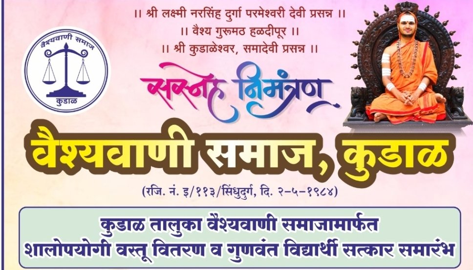 рдХреБрдбрд╛рд│ рддрд╛рд▓реБрдХрд╛ рд╡реИрд╢реНрдпрд╡рд╛рдгреА рд╕рдорд╛рдЬрд╛рдорд╛рд░реНрдлрдд рд╢рд╛рд▓реЛрдкрдпреЛрдЧреА рд╡рд╕реНрддреВ рд╡рд┐рддрд░рдг рд╡ рдЧреБрдгрд╡рдВрдд рд╡рд┐рджреНрдпрд╛рд░реНрдереА рд╕рддреНрдХрд╛рд░ рд╕рдорд╛рд░рдВрдн рдХрд╛рд░реНрдпрдХреНрд░рдорд╛рдЪреЗ рдЖрдпреЛрдЬрди рд╡реИрд╢реНрд╡рд╡рд╛рдгреА рд╕рдорд╛рдЬрд╛рдорд╛рд░реНрдлрдд рд░рд╡рд┐рд╡рд╛рд░ рджрд┐рдирд╛рдВрдХ.реирей рдЬреВрди реирежреирек.рд░реЛрдЬреА,рд╕рдХрд╛рд│реА резреж.рейреж рд╡рд╛.рд╕реНрдерд│ :рд╢реНрд░реА рдорд╣рд╛рд▓рдХреНрд╖реНрдореА рд╣реЙрд▓ рдирдВ. реи,рдХреБрдбрд╛рд│ рдпреЗрдереЗ рдХрд░рдгреНрдпрд╛рдд рдЖрд▓реЗ рдЖрд╣реЗ.рджрд░ рд╡рд░реНрд╖реА рд╡реИрд╢реНрдпрд╡рд╛рдгреА рд╕рдорд╛рдЬ рд╢рд╛рд▓реЛрдкрдпреЛрдЧреА рд╡рд╕реНрддреВ рд╡рд┐рддрд░рдг рд╡ рдЧреБрдгрд╡рдВрдд рд╡рд┐рджреНрдпрд╛рд░реНрдереНрдпрд╛рдВрдЪрд╛ рд╕рддреНрдХрд╛рд░ рд╕рдорд╛рд░рдВрдн рд╕рд╛рдЬрд░рд╛ рдХрд░рддреЗ,рдЪрд╛рд▓реВ рд╡рд░реНрд╖реА рд╕рдорд╛рдЬрд╛рддреАрд▓ рдЬреНрдпрд╛ рдореБрд▓рд╛ рдореБрд▓реАрдВрдиреА рдПрд╕.рдПрд╕.рд╕реА. рд╡ рдПрдЪ.рдПрд╕.рд╕реА. рдкрд░реАрдХреНрд╖реЗрдд репреж% рдкреЗрдХреНрд╖рд╛ рдЬрд╛рд╕реНрдд рдЧреБрдг рдкреНрд░рд╛рдкреНрдд рдХреЗрд▓реЗ рдЖрд╣реЗрдд.рддреНрдпрд╛рдВрдЪрд╛ рдЦрд╛рд╕ рд╕рддреНрдХрд╛рд░ рдХрд░рдгреНрдпрд╛рдд рдпреЗрдгрд╛рд░ рдЖрд╣реЗ.рдпрд╛ рд╕рдорд╛рд░рдВрднрд╛рд╕рд╛рдареА рдЕрдзреНрдпрдХреНрд╖ рдореНрд╣рдгреВрди рд╕реМ. рд╕реБрдЬрд╛рддрд╛ рдЧрдЬрд╛рдирди рддреЗрд▓реА рдЖрдгрд┐ рдкреНрд░рдореБрдЦ рдкрд╛рд╣реБрдгреЗ рдореНрд╣рдгреВрди рд╢реНрд░реА. рдордВрджрд╛рд░ рд╢реНрд░реАрдХреГрд╖реНрдг рд╢рд┐рд░рд╕рд╛рдЯ (рдирдЧрд░рд╕реЗрд╡рдХ, рдирдЧрд░рдкрдВрдЪрд╛рдпрдд рдХреБрдбрд╛рд│) рд╣реЗ рдЙрдкрд╕реНрдерд┐рдд рд░рд╛рд╣рдгрд╛рд░ рдЖрд╣реЗрдд.рддрд░реА рдпрд╛ рд╕рдорд╛рд░рдВрднрд╛рд╕ рдЖрдкрдг рдЕрдЧрддреНрдпрдкреВрд░реНрд╡рдХ рдЙрдкрд╕реНрдерд┐рдд рд░рд╣рд╛рд╡реЗ рдЖрдгрд┐ рдХрд╛рд░реНрдпрдХреНрд░рдорд╛рдЪреА рд╢реЛрднрд╛ рд╡реИрд╢реНрдпрд╡рд╛рдгреА рд╕рдорд╛рдЬ рдмрд╛рдВрдзрд╡рд╛рдВрдиреА рд╡рд╛рдврд╡рд╛рд╡реА рдЕрд╕реЗ рдЖрд╡рд╛рд╣рди рдХреБрдбрд╛рд│ рддрд╛рд▓реБрдХрд╛ рдЕрдзреНрдпрдХреНрд╖ рд╕реМ.рдЕрд╕реНрдорд┐рддрд╛ рджрддреНрддрд╛рддреНрд░рдп рдмрд╛рдВрджреЗрдХрд░ ,рдХрд╛рд░реНрдпрд╡рд╛рд╣ рд╕реМ. рд╕реБрдЪрд┐рддреНрд░рд╛ рд╡рд┐рдЬрдп рднреЛрдЧрдЯреЗ,рдХреБрдбрд╛рд│ рддрд╛рд▓реБрдХрд╛ рд╡реИрд╢реНрд╡рд╡рд╛рдгреА рд╕рдорд╛рдЬ рдпрд╛рдВрдЪреНрдпрд╛рдХрдбреВрди рдХрд░рдгреНрдпрд╛рдд рдЖрд▓реЗ рдЖрд╣реЗ.