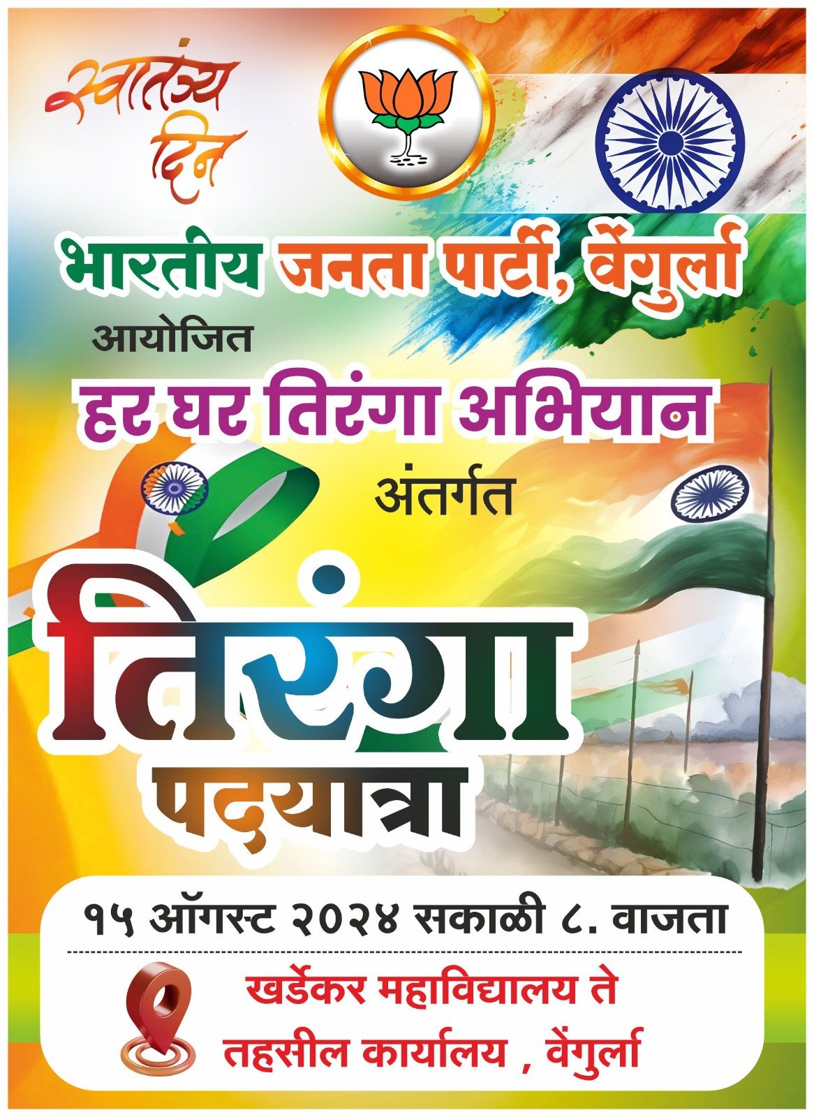 рд▓реЛрдХрдорд╛рдирд╕рд╛рдд рдЬрд╛рдЬреНрд╡рд▓ рджреЗрд╢рднрдХреНрддреА рдЪреЗ рд╕реНрдлреБрд▓рд┐рдВрдЧ рдХрд╛рдпрдо рддреЗрд╡рдд рд░рд╣рд╛рд╡реЗ рдпрд╛рд╕рд╛рдареА рднрд╛рд░рддреАрдп рдЬрдирддрд╛ рдкрд╛рд░реНрдЯреА рд╕рджреИрд╡ рдХрдЯрд┐рдмрдзреНрдж рдЖрд╣реЗ,рдпрд╛рд╕рд╛рдареА рд░рд╛рд╖реНрдЯреНрд░рд╛рднрд┐рдорд╛рди рдЬрд╛рдЧреГрдд рдХрд░реВрди рд╡реГрдзреНрджреАрдВрдЧрдд рдХрд░рдгреНрдпрд╛рд╕рд╛рдареА рднрд╛рдЬрдкрд╛ рд╡реЗрдВрдЧреБрд░реНрд▓рд╛ рдЪреНрдпрд╛ рд╡рддреАрдиреЗ рдмреЕрд░рд┐рд╕реНрдЯрд░ рдЦрд░реНрдбреЗрдХрд░ рдорд╣рд╛рд╡рд┐рджреНрдпрд╛рд▓рдп рд╡реЗрдВрдЧреБрд░реНрд▓рд╛ рддреЗ рддрд╣рд╕рд┐рд▓рджрд╛рд░ рдХрд╛рд░реНрдпрд▓рдп рд╡реЗрдВрдЧреБрд░реНрд▓рд╛ рдкрд░реНрдпрдВрдд рд╕рдХрд╛рд│реА рео.рейреж рд╡рд╛рдЬрддрд╛ рддрд┐рд░рдВрдЧрд╛ рдкрдж рдпрд╛рддреНрд░реЗрдЪреЗ рдЖрдпреЛрдЬрди рдХрд░рдгреНрдпрд╛рдд рдЖрд▓реЗрд▓реЗ рдЖрд╣реЗ. рдпрд╛рд╡реЗрд│реА рджреЗрд╢рд╛рдЪреНрдпрд╛ рд╕реАрдореЗрд╡рд░ рд╕реЗрд╡рд╛ рджреЗрдгрд╛рд▒реНрдпрд╛ рдорд╛рдЬреА рд╕реИрдирд┐рдХрд╛рдВрдЪрд╛ рд╡рд┐рд╢реЗрд╖ рд╕рдиреНрдорд╛рди рдХреЗрд▓рд╛ рдЬрд╛рдгрд╛рд░ рдЕрд╕реВрди рдпрд╛ рдорд╛рдЬреА рд╕реИрдирд┐рдХрд╛рдВрдЪреНрдпрд╛ рдиреЗрддреГрддреНрд╡рд╛рдд рд╣реА рддрд┐рд░рдВрдЧрд╛ рдкрдж рдпрд╛рддреНрд░рд╛ рдирд┐рдШрдгрд╛рд░ рдЖрд╣реЗ. рддрд░реА рдпрд╛ рддрд┐рд░рдВрдЧрд╛ рдкрдж рдпрд╛рддреНрд░реЗрдд рд╕рд░реНрд╡ рджреЗрд╢рдкреНрд░реЗрдореА рдирд╛рдЧрд░рд┐рдХрд╛рдВрдиреА рд╕рд╣рднрд╛рдЧреА рд╡реНрд╣рд╛рд╡реЗ рдЕрд╕реЗ рдЖрд╡рд╛рд╣рди рднрд╛рдЬрдкрд╛ рд╡рддреАрдиреЗ ” рд╣рд░ рдШрд░ рддрд┐рд░рдВрдЧрд╛ ” рдЕрднрд┐рдпрд╛рдирд╛рдЪреЗ рдЬрд┐рд▓реНрд╣рд╛ рд╕рдВрдпреЛрдЬрдХ рдкреНрд░рд╕рдиреНрдирд╛ рдЙрд░реНрдл рдмрд╛рд│реВ рджреЗрд╕рд╛рдИ рдпрд╛рдВрдиреА рдХреЗрд▓реЗ рдЖрд╣реЗ.