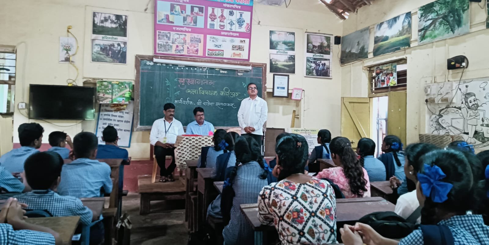 рд░рд╛рдЬреЗрд╢ рдореНрд╣рд╛рдкрдгрдХрд░ рдпрд╛рдВрдиреА рдХрд▓рд╛рдХреНрд╖реЗрддреНрд░рд╛рддреАрд▓ рдЖрдкрд▓реА рд╡рд╛рдЯрдЪрд╛рд▓ рдХрд╢реА рдЭрд╛рд▓реА рддреЗ рдореБрд▓рд╛рдВрдирд╛ рд╕рд╛рдВрдЧрд┐рддрд▓реЗ рддреНрдпрд╛рдЪрдкреНрд░рдорд╛рдгреЗ рдЖрдЬ рдЖрдкрдг рдХрд░рдд рдЕрд╕рд▓реЗрд▓реНрдпрд╛ рдХрд╛рдорд╛рдЪреА рд░рдВрдЧреАрдд рдЪрд┐рддреНрд░ рд╣реА рдореБрд▓рд╛рдВрдирд╛ рджрд╛рдЦрд╡рд▓реА рдХрд▓рд╛ рд╡рд┐рд╖рдпрд╛рддреВрди рдкрд╛рдЯ рд╣рд╛рдпрд╕реНрдХреВрд▓ рдордзреВрди рдШрдбрд▓реЗрд▓реА рдореБрд▓реЗ рдЖрдЬ рдХреЛрдгрдХреЛрдгрддреНрдпрд╛ рдХреНрд╖реЗрддреНрд░рд╛рдд рдХрд╛рд░реНрдпрд░рдд рдЖрд╣реЗрдд рддреНрдпрд╛рдЪрд╛рд╣реА рдЖрдврд╛рд╡рд╛ рдШреЗрддрд▓рд╛ рдпрд╛ рдХрд╛рд░реНрдпрдХреНрд░рдорд╛рдЪреЗ рдЖрдпреЛрдЬрди рдХрд▓рд╛рд╢рд┐рдХреНрд╖рдХ рд╢реНрд░реА рд╕рдВрджреАрдк рд╕рд╛рд│рд╕рдХрд░ рдпрд╛рдВрдиреА рдХреЗрд▓реЗ рддрд░ рд░рд╛рдЬреЗрд╢ рдореНрд╣рд╛рдкрдгрдХрд░ рдпрд╛рдВрдЪреЗ рд╕реНрд╡рд╛рдЧрдд рдЖрдгрд┐ рдпрд╛ рдХрд╛рд░реНрдпрдХреНрд░рдорд╛рдЪреЗ рдЖрднрд╛рд░ рд╢реНрд░реА рд╕рдпрд╛рдЬреА рдмреЛрдВрджрд░ рд╕рд░ рдпрд╛рдВрдиреА рдХреЗрд▓реЗ.