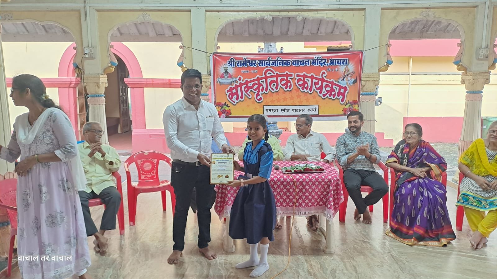 рд╢реНрд░реА рд░рд╛рдореЗрд╢реНрд╡рд░ рд╡рд╛рдЪрди рдордВрджрд┐рд░, рдЖрдЪрд░рд╛ рдЖрдпреЛрдЬрд┐рдд рд╢реНрд░реА.рд╡рд┐рд╡реЗрдХ рд╕реБрдЦрдЯрдгрдХрд░ рдореБрдВрдмрдИ, рдХреИ. рдЖрдмрд╛ рд░реЗрдбрдХрд░ (рдорд╛рдЬреА рдХрд╛рд░реНрдпрдХрд╛рд░рд┐рдгреА рд╕рджрд╕реНрдп ) рд╡ рд╢реНрд░реА. рдкреНрд░рдХрд╛рд╢ рдорд╣рд╛рднреЛрдЬ(рд╢рд┐рдХреНрд╖рдХ рдЖрдЪрд░рд╛ рд╣рд╛рдпрд╕реНрдХреВрд▓) рдкреБрд░рд╕реНрдХреГрдд рдЪрд┐рддреНрд░рдХрд▓рд╛ рд╕реНрдкрд░реНрдзреЗрдд