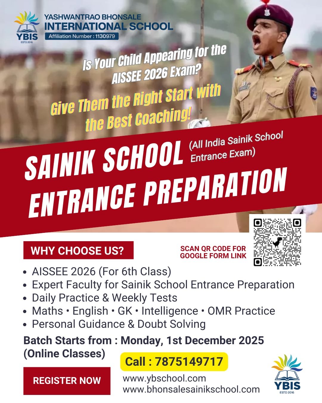 _рдпрд╢рд╡рдВрддрд░рд╛рд╡ рднреЛрд╕рд▓реЗ рдЗрдВрдЯрд░рдиреЕрд╢рдирд▓ рд╕реНрдХреВрд▓, рд╕рд╛рд╡рдВрддрд╡рд╛рдбреА рдпрд╛рдВрдЪреНрдпрд╛ рд╡рддреАрдиреЗ AISSEE 2026 (рдСрд▓ рдЗрдВрдбрд┐рдпрд╛ рд╕реИрдирд┐рдХ рд╕реНрдХреВрд▓ рдкреНрд░рд╡реЗрд╢ рдкрд░реАрдХреНрд╖рд╛ тАУ рдЗрдпрддреНрддрд╛ рд╕рд╣рд╛рд╡реА) рджреЗрдгрд╛рд▒реНрдпрд╛ рд╡рд┐рджреНрдпрд╛рд░реНрдереНрдпрд╛рдВрд╕рд╛рдареА рд╡рд┐рд╢реЗрд╖ рдорд╛рд░реНрдЧрджрд░реНрд╢рди рд╡рд░реНрдЧ рд╕реБрд░реВ рдХрд░рдгреНрдпрд╛рдд рдпреЗрдд рдЖрд╣реЗ. рдпрд╛ рдЙрдкрдХреНрд░рдорд╛рдЪрд╛ рдореБрдЦреНрдп рдЙрджреНрджреЗрд╢ рд╡рд┐рджреНрдпрд╛рд░реНрдереНрдпрд╛рдВрдирд╛ рдЧреБрдгрд╡рддреНрддрд╛рдкреВрд░реНрдг рдкреНрд░рд╢рд┐рдХреНрд╖рдг рджреЗрдКрди рдкреНрд░рд╡реЗрд╢ рдкрд░реАрдХреНрд╖реЗрдд рдпрд╢ рдорд┐рд│рд╡реВрди рджреЗрдгреЗ рд╣рд╛ рдЖрд╣реЗ. рдпрд╛рдордзреНрдпреЗ рдЕрдиреБрднрд╡реА рд╡ рддрдЬреНрдЬреНрдЮ рд╢рд┐рдХреНрд╖рдХрд╛рдВрдХрдбреВрди рдСрдирд▓рд╛рдИрди рдкрджреНрдзрддреАрдиреЗ рдирд┐рдпрдорд┐рдд рдЕрдзреНрдпрд╛рдкрди рдХреЗрд▓реЗ рдЬрд╛рдгрд╛рд░ рдЖрд╣реЗ._
