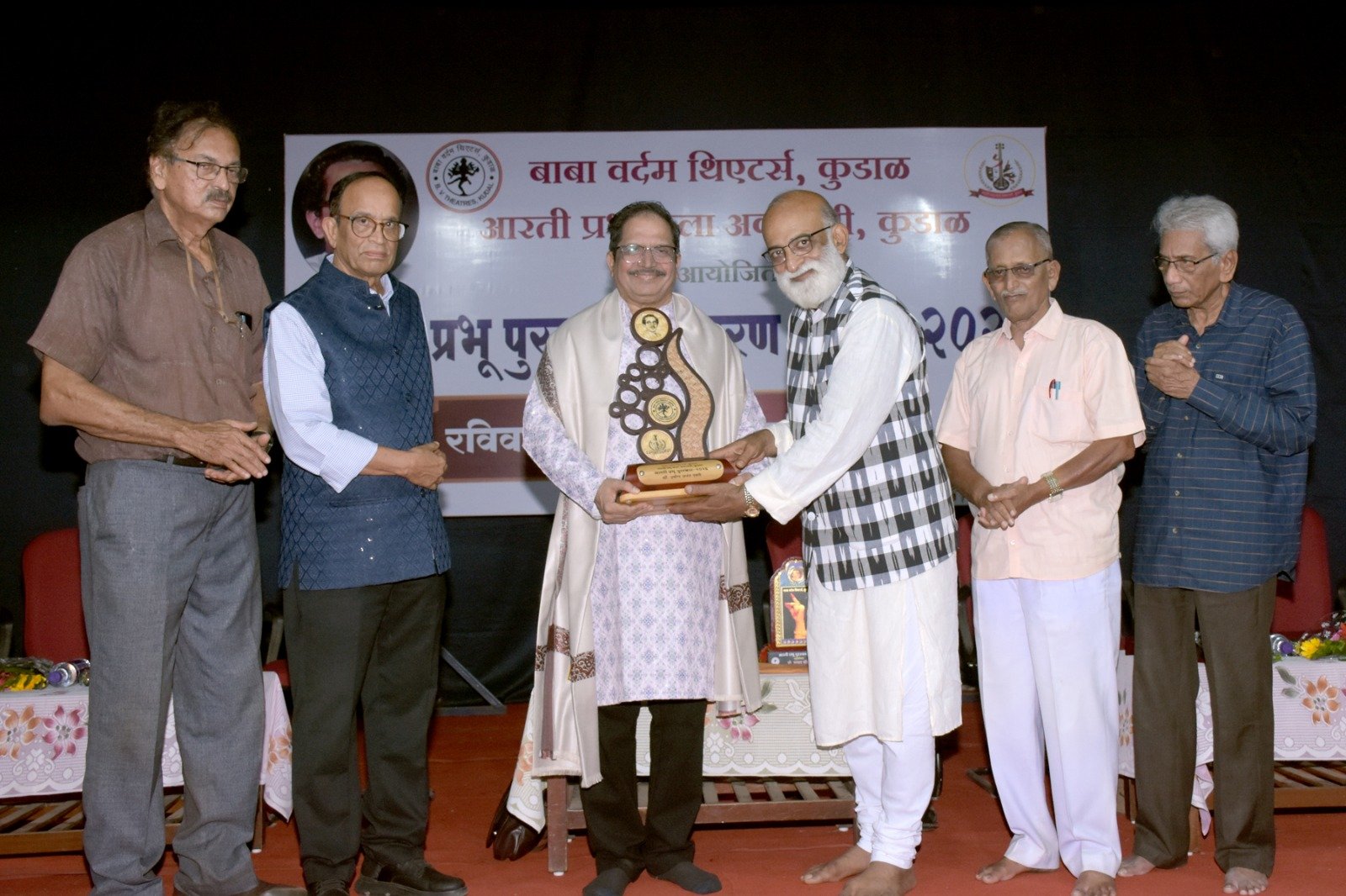 рдЪрд┐рдВ рддреНрд░реНрдпрдВ рдЦрд╛рдиреЛрд▓рдХрд░ рддрдерд╛ рдЖрд░рддреА рдкреНрд░рднреВ рд╣реЗ рдХреБрдбрд╛рд│рдЪреЗ рд╕реБрдкреБрддреНрд░ рддреНрдпрд╛рдореБрд│реЗ рд╕рди реирежрезрей рдкрд╛рд╕реВрди рдХрд╡рд┐рддрд╛ рдЖрдгрд┐ рдирд╛рдЯреНрдпрдХреНрд╖реЗрддреНрд░рд╛рдд рдЙрд▓реНрд▓реЗрдЦрдиреАрдп рдХрд╛рдордЧрд┐рд░реА рдХрд░рдгрд╛рд▒реНрдпрд╛ рдХрд╡реА рдХрд┐рдВрд╡рд╛ рдирд╛рдЯрдХрдХрд╛рд░рд╛рд╕ рд╣рд╛ рдкреБрд░рд╕реНрдХрд╛рд░ рджрд░рд╡рд░реНрд╖реА рджрд┐рд▓рд╛ рдЬрд╛рддреЛ. рдЖрддрд╛рдкрд░реНрдпрдВрдд резреи рдЬрдгрд╛рдВрдирд╛ рд╣рд╛ рдкреБрд░рд╕реНрдХрд╛рд░ рдкреНрд░рд╛рдкреНрдд рдЭрд╛рд▓рд╛ рдЖрд╣реЗ. рдпрдВрджрд╛рдЪрд╛ рд╣рд╛ рддреЗрд░рд╛рд╡рд╛ рдЖрд░рддреА рдкреНрд░рднреВ рдкреБрд░рд╕реНрдХрд╛рд░ рд╡рд┐рддрд░рдг рд╕реЛрд╣рд│рд╛ рдпреЗрдереАрд▓ рд╕рдВрдд рд░рд╛рдКрд│ рдорд╣рд╛рд░рд╛рдЬ рдорд╣рд╛рд╡рд┐рджреНрдпрд╛рд▓рдпрд╛рдЪреНрдпрд╛ рдХреИ рдПрдХрдирд╛рде рдард╛рдХреВрд░ рд╕рднрд╛рдЧреГрд╣рд╛рдд рд╕рдВрдкрдиреНрди рдЭрд╛рд▓рд╛. рдЖрд░рддреА рдкреНрд░рднреВ рдХрд▓рд╛ рдЕрдХрд╛рджрдореАрдЪреЗ рдЕрдзреНрдпрдХреНрд╖ рдЕрдирдВрдд рд╡реИрджреНрдп рдпрд╛рдВрдЪреНрдпрд╛ рдЕрдзреНрдпрдХреНрд╖рддреЗрдЦрд╛рд▓реА рд╕рдВрдкрдиреНрди рдЭрд╛рд▓реЗрд▓реНрдпрд╛ рдпрд╛ рдХрд╛рд░реНрдпрдХреНрд░рдорд╛рд▓рд╛ рдЖрд░рддреА рдкреНрд░рднреВ рдкреБрд░рд╕реНрдХрд╛рд░ рд╡рд┐рдЬреЗрддреЗ рдХрд╡реА рдкреНрд░рд╛. рдкреНрд░рд╡реАрдг рджрд╡рдгреЗ, рдЬреНрдпреЗрд╖реНрда рдЕрднрд┐рдиреЗрддреЗ рдкреНрд░рд╕рд╛рдж рдкрдВрдбрд┐рдд, рдЕрдореЗрд░рд┐рдХрд╛рд╕реНрдерд┐рдд рдкреНрд░рдЦреНрдпрд╛рдд рд╕реНрддреНрд░реАрд░реЛрдЧрддрдЬреНрдЬреНрдЮ рдбреЙ. рдЕрдирд┐рд▓ рдиреЗрд░реБрд░рдХрд░, рдХрдорд╢рд┐рдкреНрд░ рдордВрдбрд│рд╛рдЪреЗ рдЙрдкрдХрд╛рд░реНрдпрд╛рдзреНрдпрдХреНрд╖ рдЕрд░рд╡рд┐рдВрдж рд╢рд┐рд░рд╕рд╛рдЯ, рдЬреНрдпреЗрд╖реНрда рджрд┐рдЧреНрджрд░реНрд╢рдХ рдЖрдгрд┐ рдмрд╛рдмрд╛ рд╡рд░реНрджрдо рдерд┐рдпреЗрдЯрд░реНрд╕рдЪреЗ рд╕рдВрд╕реНрдерд╛рдкрдХ рдЪрдВрджреВ рд╢рд┐рд░рд╕рд╛рдЯ рд╡реНрдпрд╛рд╕рдкреАрдард╛рд╡рд░ рдЙрдкрд╕реНрдерд┐рдд рд╣реЛрддреЗ. рдЬреНрдпреЗрд╖реНрда рдЕрднрд┐рдиреЗрддреЗ рдкреНрд░рд╕рд╛рдж рдкрдВрдбрд┐рдд рдпрд╛рдВрдЪреНрдпрд╛рд╕рд╣ рдЙрдкрд╕реНрдерд┐рдд рдорд╛рдиреНрдпрд╡рд░рд╛рдВрдЪреНрдпрд╛ рд╣рд╕реНрддреЗ рджреАрдк рдкреНрд░рдЬреНрд╡рд▓рди, рдбреЙ. рдЕрдирд┐рд▓ рдиреЗрд░реБрд░рдХрд░ рдпрд╛рдВрдЪреНрдпрд╛ рд╣рд╕реНрддреЗ рд╕рд░рд╕реНрд╡рддреА рдкреВрдЬрди рдЖрдгрд┐ рдкреНрд░рд╛. рдкреНрд░рд╡реАрдг рджрд╡рдгреЗ рдпрд╛рдВрдЪреНрдпрд╛ рд╣рд╕реНрддреЗ рдЖрд░рддреА рдкреНрд░рднреВ рдпрд╛рдВрдЪреНрдпрд╛ рдкреНрд░рддрд┐рдореЗрдЪреЗ рдкреВрдЬрди рдХрд░реВрди рдХрд╛рд░реНрдпрдХреНрд░рдорд╛рдЪрд╛ рд╢реБрднрд╛рд░рдВрдн рдЭрд╛рд▓рд╛.