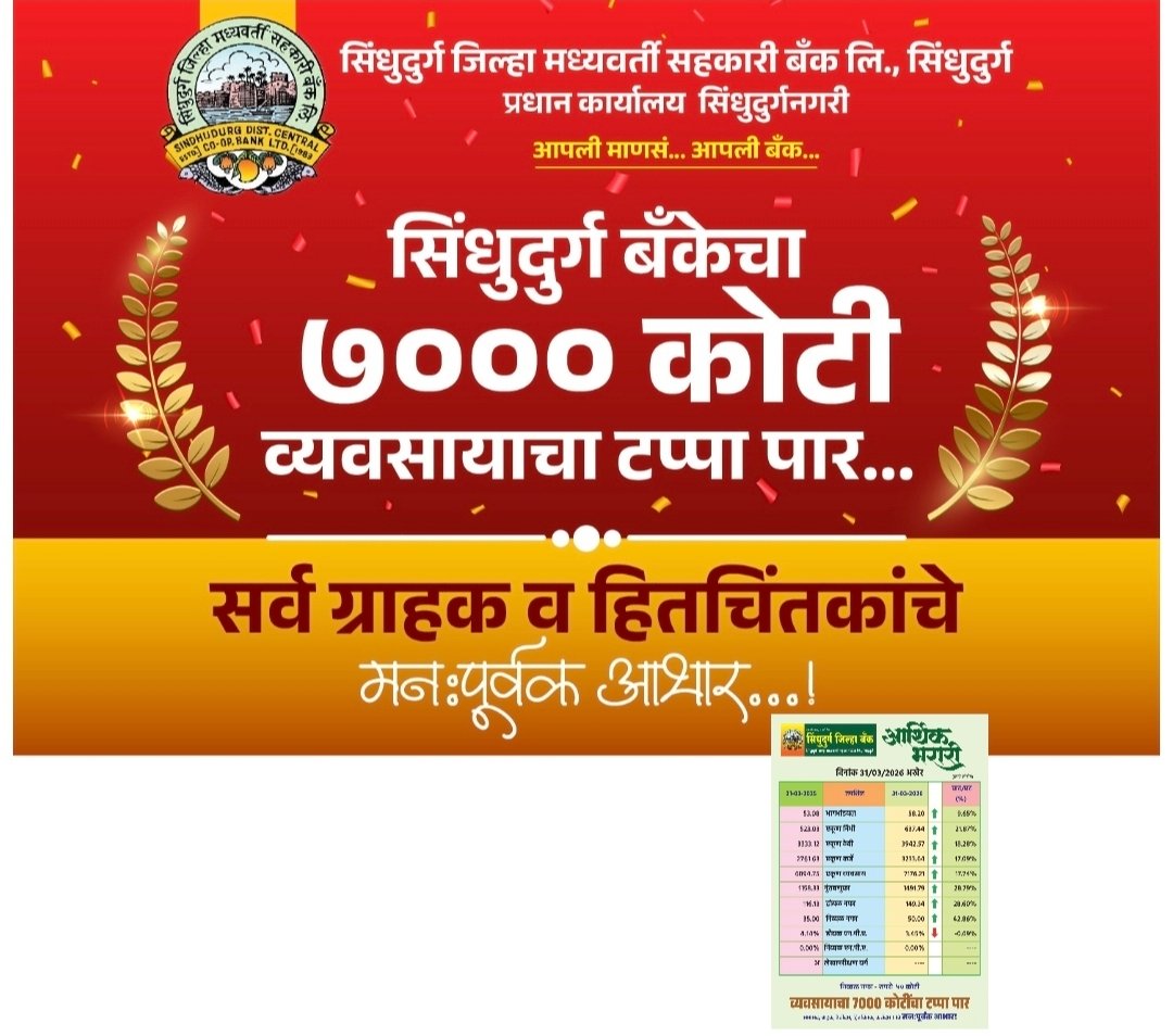 рд╕рд┐рдВрдзреБрджреБрд░реНрдЧ рдЬрд┐рд▓реНрд╣рд╛ рдмрдБрдХреЗрдиреЗ рдЪрд╛рд▓реВ рдЖрд░реНрдерд┐рдХ рдЖрд░реНрдерд┐рдХ рд╡рд░реНрд╖рд╛рдд рднрд░реАрд╡ рдХрд╛рдордЧрд┐рд░реА рдХреЗрд▓реА рдЖрд╣реЗ. рд╣реА рдХрд╛рдордЧрд┐рд░реА рдХрд░рдд рдЕрд╕рддрд╛рдирд╛ рд░реБрдкрдпреЗ 7000 рдХреЛрдЯреА рдПрд╡рдвреА рдмрдБрдХреЗрдЪреНрдпрд╛ рд╡реНрдпрд╡рд╕рд╛рдпрдЪрд╛ рдЯрдкреНрдкрд╛ рдпрд╢рд╕реНрд╡реА рд░рд┐рддреНрдпрд╛ рдкрд░ рдХреЗрд▓рд╛ рдЖрд╣реЗ. рдорд╛. рдЕрдзреНрдпрдХреНрд╖ рдорд╣реЛрджрдп рд╢реНрд░реА рдордиреАрд╖ рджрд│рд╡реА рдпрд╛рдВрдиреА рд╕рд░реНрд╡ рдареЗрд╡реАрджрд╛рд░ рдХрд░реНрдЬрджрд╛рд░ рд╕рд░реНрд╡рдЪ рдЧреНрд░рд╛рд╣рдХ рд╡ рдмрдБрдХреЗрдЪреЗ рд╣рд┐рддрдЪрд┐рдВрддрдХрд╛рдВрдирд╛ рдмрдБрдХреЗрд╡рд░ рджрд╛рдЦрд╡рд▓реЗрд▓реНрдпрд╛ рд╡рд┐рд╢реНрд╡рд╛рд╕рд╛ рдмрджреНрджрд▓ рдзрдиреНрдпрд╡рд╛рдж рджрд┐рд▓реЗ рдЖрд╣реЗрдд рд╡ рдЕрднрд┐рдирдВрджрди рдХреЗрд▓реЗ рдЖрд╣реЗ.