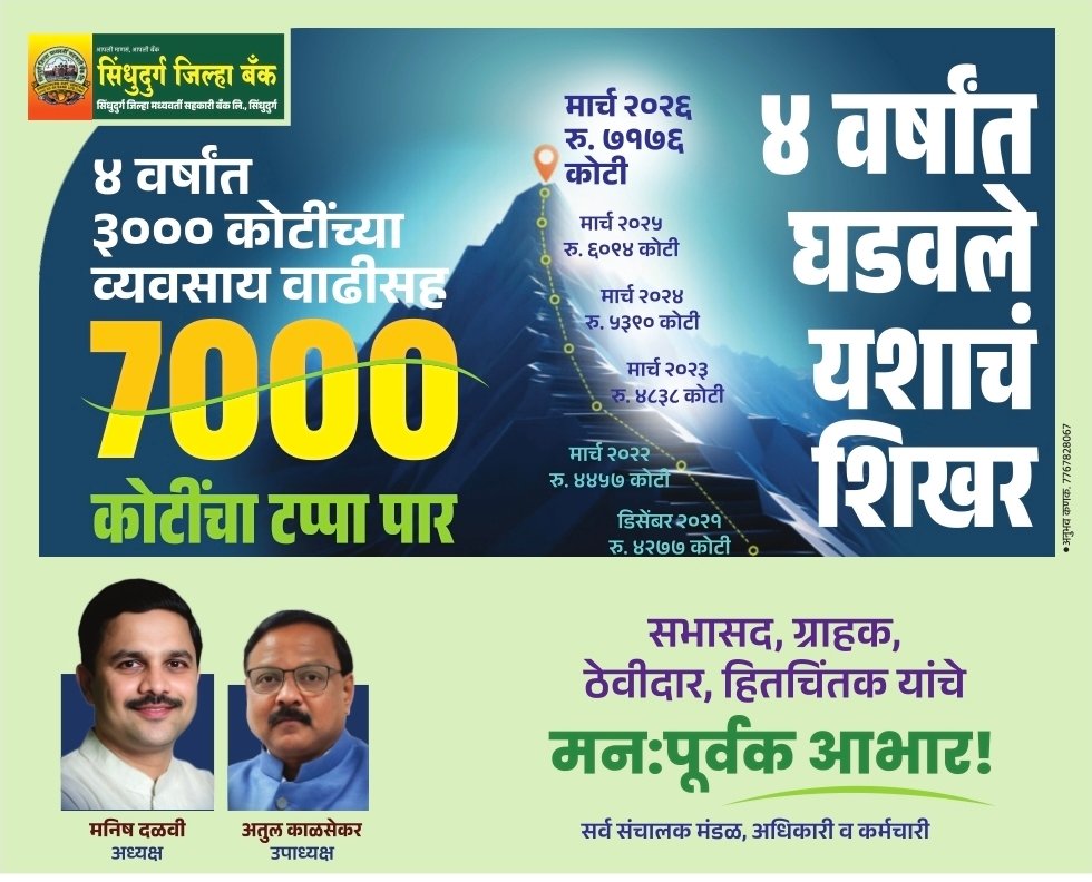 рдЪрд╛рд░ рд╡рд░реНрд╖рд╛рдВрдд рддреАрди рд╣рдЬрд╛рд░ рдХреЛрдЯреАрдВрдЪреНрдпрд╛ рд╡реНрдпрд╡рд╕рд╛рдп рд╡рд╛рдвреАрд╕рд╣ 7000 рдХреЛрдЯреАрдВрдЪрд╛ рдЯрдкреНрдкрд╛ рдкрд╛рд░ рдХреЗрд▓реЗрд▓реА рд╕рд┐рдВрдзреБрджреБрд░реНрдЧ рдЬрд┐рд▓реНрд╣реНрдпрд╛рддреАрд▓ рд╕рд┐рдВрдзреБрджреБрд░реНрдЧ рдЬрд┐рд▓реНрд╣рд╛ рдордзреНрдпрд╡рд░реНрддреА рд╕рд╣рдХрд╛рд░реА рдмрдБрдХ рд▓рд┐. рд╕рд┐рдВрдзреБрджреБрд░реНрдЧ.