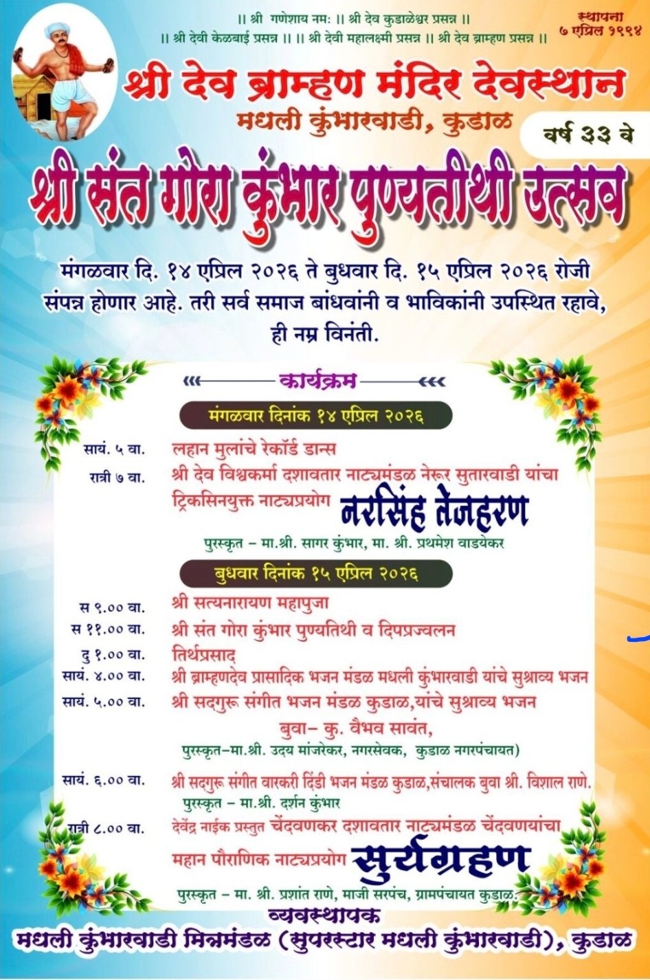 рдХреБрдбрд╛рд│ рд╢рд╣рд░рд╛рддреАрд▓ рдордзрд▓реА рдХреБрдВрднрд╛рд░рд╡рд╛рдбреА рдпреЗрдереАрд▓ рд╢реНрд░реА рджреЗрд╡ рдмреНрд░рд╛рд╣реНрдордг рдордВрджрд┐рд░ рджреЗрд╡рд╕реНрдерд╛рди рдпреЗрдереЗ рдордВрдЧрд│рд╡рд╛рд░ рджрд┐рдирд╛рдВрдХ резрек.режрек. реирежреирем. рд░реЛрдЬреА рдмреБрдзрд╡рд╛рд░ рджрд┐.резрел рдПрдкреНрд░рд┐рд▓ реирежреирем рд░реЛрдЬреА рд╢реНрд░реА рд╕рдВрдд рдЧреЛрд░рд╛ рдХреБрдВрднрд╛рд░ рдкреБрдгреНрдпрддрд┐рдереА рдЙрддреНрд╕рд╡ рдЙрддреНрд╕рд╛рд╣рд╛рдд рд╕рд╛рдЬрд░рд╛ рдХрд░рдгреНрдпрд╛рдд рдпреЗрдгрд╛рд░ рдЖрд╣реЗ. рдпрд╛ рдирд┐рдорд┐рддреНрдд рдордВрдЧрд│рд╡рд╛рд░, резрек рдПрдкреНрд░рд┐рд▓ рд░реЛрдЬреА рд╕рд╛рдпрдВрдХрд╛рд│реА рел рд╡рд╛рдЬрддрд╛ рд▓рд╣рд╛рди рдореБрд▓рд╛рдВрдЪреЗ рд░реЗрдХреЙрд░реНрдб рдбрд╛рдиреНрд╕ рдХрд╛рд░реНрдпрдХреНрд░рдо рд╣реЛрдгрд╛рд░ рдЕрд╕реВрди, рд░рд╛рддреНрд░реА рен рд╡рд╛рдЬрддрд╛ рд╢реНрд░реА рджреЗрд╡ рд╡рд┐рд╢реНрд╡рдХрд░реНрдорд╛ рджрд╢рд╛рд╡рддрд╛рд░ рдирд╛рдЯреНрдп рдордВрдбрд│ рдиреЗрд░реВрд░ рд╕реБрддрд╛рд░рд╡рд╛рдбреА рдпрд╛рдВрдЪрд╛ рдирд╛рдЯреНрдпрдкреНрд░рдпреЛрдЧ- “рдирд░рд╕рд┐рдВрд╣ рддреЗрдЬрд╣рд░рдг” рд╕рд╛рджрд░ рдХрд░рдгреНрдпрд╛рдд рдпреЗрдгрд╛рд░ рдЖрд╣реЗ.рдмреБрдзрд╡рд╛рд░, резрел рдПрдкреНрд░рд┐рд▓ рд░реЛрдЬреА рд╕рдХрд╛рд│реА реп рд╡рд╛рдЬрддрд╛ рд╢реНрд░реА рд╕рддреНрдпрдирд╛рд░рд╛рдпрдг рдорд╣рд╛рдкреВрдЬрд╛, рддреНрдпрд╛рдирдВрддрд░ рд╕рдХрд╛рд│реА резрез рд╡рд╛рдЬрддрд╛ рд╢реНрд░реА рд╕рдВрдд рдЧреЛрд░рд╛ рдХреБрдВрднрд╛рд░ рдкреБрдгреНрдпрддрд┐рдереА рд╕реЛрд╣рд│рд╛ рд╡ рджреАрдкрдкреНрд░рдЬреНрд╡рд▓рди рдкрд╛рд░ рдкрдбреЗрд▓. рджреБрдкрд╛рд░реА рез рд╡рд╛рдЬрддрд╛ рддреАрд░реНрдердкреНрд░рд╕рд╛рджрд╛рдЪреЗ рдЖрдпреЛрдЬрди рдХрд░рдгреНрдпрд╛рдд рдЖрд▓реЗ рдЖрд╣реЗ. рд╕рд╛рдпрдВрдХрд╛рд│реА рек рд╡рд╛рдЬрддрд╛ рд╢реНрд░реА рдмреНрд░рд╛рд╣реНрдордгрджреЗрд╡ рдкреНрд░рд╛. рднрдЬрди рдордВрдбрд│ (рдордзрд▓реА рдХреБрдВрднрд╛рд░рд╡рд╛рдбреА) рдЪреЗ рднрдЬрди, рел рд╡рд╛рдЬрддрд╛ рд╢реНрд░реА рд╕рджрдЧреБрд░реВ рд╕рдВрдЧреАрдд рднрдЬрди рдордВрдбрд│ рдХреБрдбрд╛рд│рдЪреЗ рднрдЬрди, рем рд╡рд╛рдЬрддрд╛ рд╢реНрд░реА рд╕рджреНрдЧреБрд░реВ рд╕рдВрдЧреАрдд рд╡рд╛рд░рдХрд░реА рджрд┐рдВрдбреА рднрдЬрди рдордВрдбрд│ рдХреБрдбрд╛рд│рдЪреЗ рд╡рд╛рд░рдХрд░реА рджрд┐рдВрдбреА рднрдЬрдирд╣реА рд╣реЛрдгрд╛рд░ рдЖрд╣реЗ. рд░рд╛рддреНрд░реА рео рд╡рд╛рдЬрддрд╛ рджреЗрд╡реЗрдВрджреНрд░ рдирд╛рдИрдХ рдкреНрд░рд╕реНрддреБрдд рдЪреЗрдВрджрд╡рдгрдХрд░ рджрд╢рд╛рд╡рддрд╛рд░ рдирд╛рдЯреНрдп рдордВрдбрд│ (рдЪреЗрдВрджрд╡рдг) рдЪрд╛ “рд╕реВрд░реНрдпрдЧреНрд░рд╣рдг” рд╣рд╛ рдирд╛рдЯреНрдпрдкреНрд░рдпреЛрдЧ рд╕рд╛рджрд░ рд╣реЛрдгрд╛рд░ рдЖрд╣реЗ. рдпрд╛ рджреЛрди рджрд┐рд╡рд╕реАрдп рдХрд╛рд░реНрдпрдХреНрд░рдорд╛рд▓рд╛ рд╕рд░реНрд╡рд╛рдиреА рдореЛрдареНрдпрд╛ рд╕рдВрдЦреНрдпреЗрдиреЗ рдЙрдкрд╕реНрдерд┐рдд рд░рд╛рд╣рд╛рд╡реЗ, рдЕрд╕реЗ рдЖрд╡рд╛рд╣рди рдЖрдпреЛрдЬрдХрд╛рдВрдЪреНрдпрд╛ рд╡рддреАрдиреЗ рдордзрд▓реА рдХреБрдВрднрд╛рд░рд╡рд╛рдбреА рдорд┐рддреНрд░рдордВрдбрд│ (рд╕реБрдкрд░рд╕реНрдЯрд╛рд░) рдпрд╛рдВрдЪ