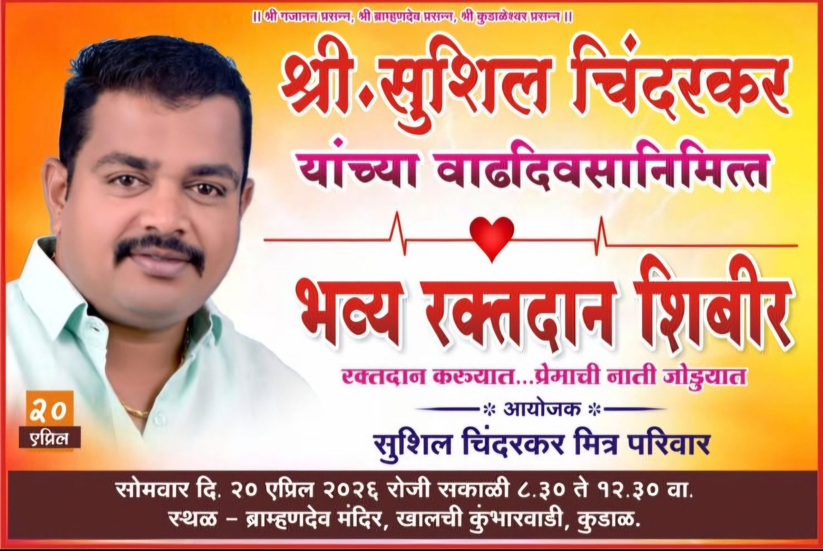 рдЙрджреНрдзрд╡ рдмрд╛рдмрд╛рд╕рд╛рд╣реЗрдм рдард╛рдХрд░реЗ рдкрдХреНрд╖рд╛рдЪреЗ рдХреБрдбрд╛рд│ рд╢рд┐рд╡рд╕реЗрдирд╛ рд╢рд╣рд░ рдирд┐рд░реАрдХреНрд╖рдХ рд╢реНрд░реА. рд╕реБрд╢реАрд▓ рдЪрд┐рдВрджрд░рдХрд░ рдпрд╛рдВрдЪреНрдпрд╛ рд╡рд╛рдврджрд┐рд╡рд╕рд╛рдЪреНрдпрд╛ рдирд┐рдорд┐рддреНрддрд╛рдиреЗ рд╢реНрд░реА. рд╕реБрд╢реАрд▓ рдЪрд┐рдВрджрд░рдХрд░ рдорд┐рддреНрд░ рдордВрдбрд│рд╛рдЪреНрдпрд╛ рд╡рддреАрдиреЗ рд░рдХреНрддрджрд╛рди рд╣реЗрдЪ рд╢реНрд░реЗрд╖реНрдарджрд╛рди рдХрд░реБрдпрд╛ рдЖрдгрд┐ рдкреНрд░реЗрдорд╛рдЪреА рдирд╛рддреА рдЬреЛрдбреНрдпрд╛рдд рдорджрдд рдХрд░реВрдпрд╛ рдпрд╛рдЪ рд╣реЗрддреВрдиреЗ рд╕реЛрдорд╡рд╛рд░ рджрд┐рдирд╛рдВрдХ 20.04.2026 рд░реЛрдЬреА рд╕рдХрд╛рд│реА 8.30 рддреЗ,12.30 рд╡рд╛рдЬреЗрдкрд░реНрдпрдВрдд рдХреБрдбрд╛рд│ рд╢рд╣рд░рд╛рддреАрд▓ рд╕реНрдерд│ – рдмреНрд░рд╛рдореНрд╣рдгрджреЗрд╡ рдордВрджрд┐рд░,рдЦрд╛рд▓рдЪреА рдХреБрдВрднрд╛рд░рд╡рд╛рдбреА, рдХреБрдбрд╛рд│ рдпреЗрдереЗ рд╕реБрд╢реАрд▓ рдЪрд┐рдВрджрд░рдХрд░ рдпрд╛рдВрдЪреНрдпрд╛ рдорд┐рддреНрд░рдкрд░рд┐рд╡рд╛рд░ рдпрд╛рдВрдЪреНрдпрд╛рдХрдбреВрди рднрд╡реНрдп рд░рдХреНрддрджрд╛рди рд╢рд┐рдмреАрд░рд╛рдЪреЗ рдЖрдпреЛрдЬрди рдХрд░рдгреНрдпрд╛рдд рдЖрд▓реЗ рдЖрд╣реЗ.рдпрд╛ рдирд┐рдорд┐рддреНрдд рд░рдХреНрддрджрд╛рддреНрдпрд╛рдВрдиреА рдЖрдкрд▓реЗ рд░рдХреНрддрджрд╛рди рдХрд░рд╛рд╡реЗ рдЕрд╕реЗ рдорд┐рддреНрд░рдордВрдбрд│рд╛рдЪреНрдпрд╛ рд╡рддреАрдиреЗ рдЖрд╡рд╛рд╣рди рдХрд░рдгреНрдпрд╛рдд рдпреЗрдд рдЖрд╣реЗ.рд╕рдВрдкрд░реНрдХ рдХрд░рдгреНрдпрд╛рд╕рд╛рдареА рдпрд╛ 94209 03330 рдирдВрдмрд░ рд▓рд╛ рдХрд│рд╡рд╛рд╡реЗ.