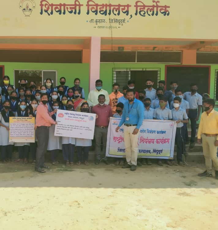 जिल्हा रुग्णालय सिंधुदुर्गच्या वतीने राष्ट्रीय तंबाखू नियंत्रण कार्यक्रम तंबाखूमुक्त शाळा अभियान व जिल्हा मानसिक आरोग्य या संबंधित कुडाळ तालुक्यातील हिर्लोक हायस्कूल मध्ये इयत्ता १० वी वर्गाच्या मुलांना व्यसन मुक्ती पान, तंबाखू, स्टार, गुटखा मुखाचे रोग कॅन्सर याबाबत कार्मीस आल्मेडा, विजय सोनारे यांनी मार्गदर्शन केले. तर सद्य परिस्थितीत लहानापासून मोठयापर्यंत लोक छोट्या – छोट्या गोष्टीसाठी ताणतणाव घेऊन आत्महत्या, डिप्रेशन खाली जातात. या संबंधित पूनम गावडे ( परिचारिका जिल्हा मानसिक आरोग्य ) यांनी मार्गदर्शन केले. प्रशालेचे मुख्याध्यापक बारदेस्कर व शिक्षक कर्मचारी वर्ग यांनी जिल्हा रुग्णालयाचे आभार मानले.