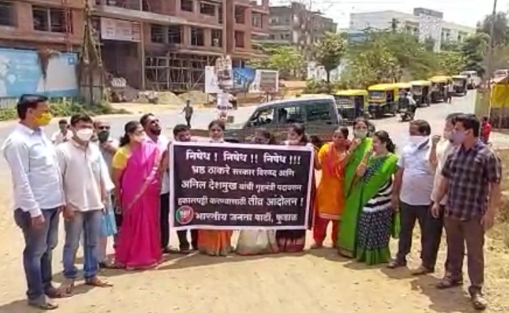 ठाकरे सरकार मधील गृहमंत्री अनिल देशमुख यांनी प्रत्येक महिन्याला 100 कोटी रुपयांची वसुली करण्याचं टार्गेट सचिन वाझे यांना दिलं होतं,असा खळबळजनक दावा करणारे पत्र मुख्यमंत्री उद्धव ठाकरे यांना देत “महाआघाडी” सरकार मधील “महाभ्रष्टाचार” मुंबईचे माजी पोलीस आयुक्त परमबीर सिंग यांनी चव्हाट्यावर आणला आहे.यामुळे महाराष्ट्रात ‘आंधळं दळत कुत्रा पीठ खातो’ अशी दयनीय अवस्था करणाऱ्या महाआघाडी ठाकरे सरकारच्या दृष्कृत्यांचा निषधे करण्यासाठी आणि गृहमंत्री अनिल देशमुख यांनी त्वरीत राजीनामा द्यावा या मागणीकरिता कुडाळ मंडलातील भाजपा पदाधिकारी कार्यकर्ता आणि लोकप्रतिनिधी यांनी आज रविवार दिनांक 21 मार्च रोजी दुपारी 12 वाजता कुडाळ पोस्ट ऑफिस चौकात भ्रष्ट सरकार व अनिल देशमुख यांच्या विरोधात घोषणाबाजी करत तीव्र आंदोलन केले.